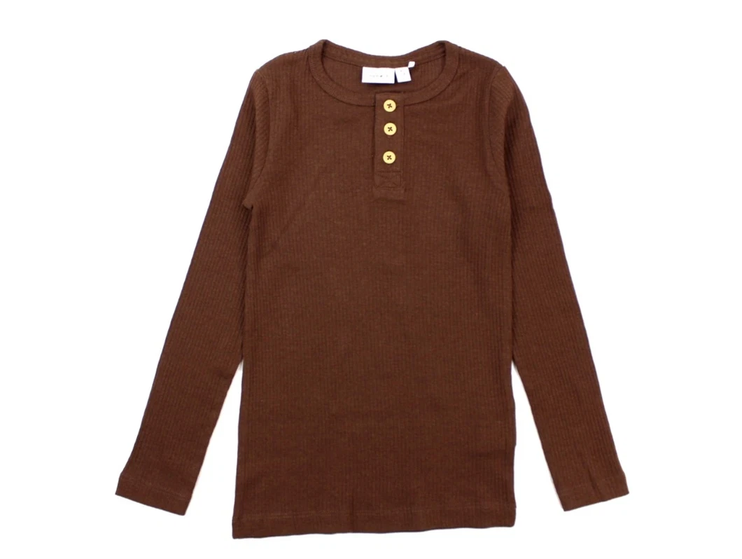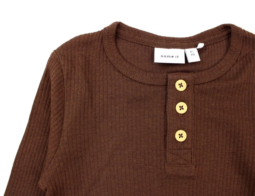 Langærmet t-shirt i ribkvalitet i økologisk bomuld i farven rocky road fra Name It.