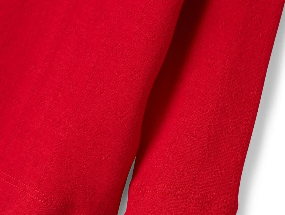 Blød og strækbar t-shirt med lange ærmer i en smuk rød nuance med fint pointellestrik, der skaber et dekorativt hulmønster med hjerter.