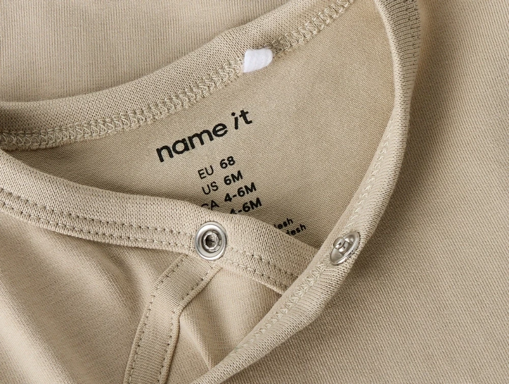 Body i beige nuance (island fossil) fra Name It med praktisk slå-om lukning. Modellen har lange ærmer og trykknapper foran og forneden, som gør det nemt at klæde barnet på og skifte ble.