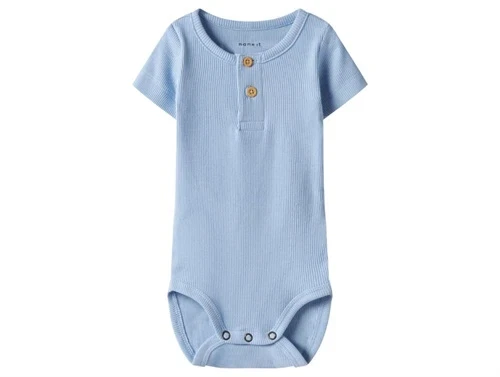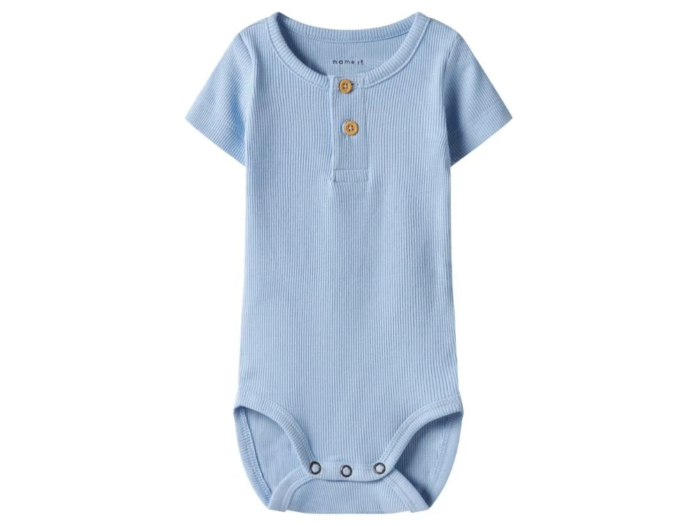 Forny din babys garderobe med denne klassiske lyseblå kortærmede body fra Name It. Bodyen er lavet af en blanding af 57% økologisk bomuld, 38% modal og 5% elastan, hvilket giver en blød og behagelig kvalitet.