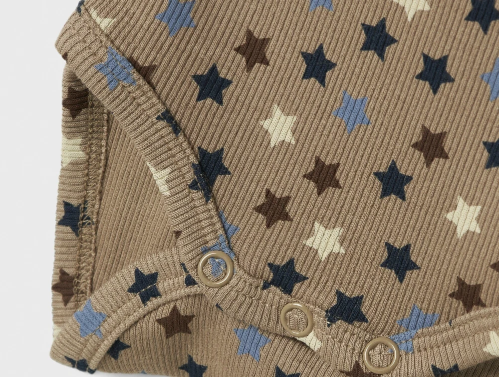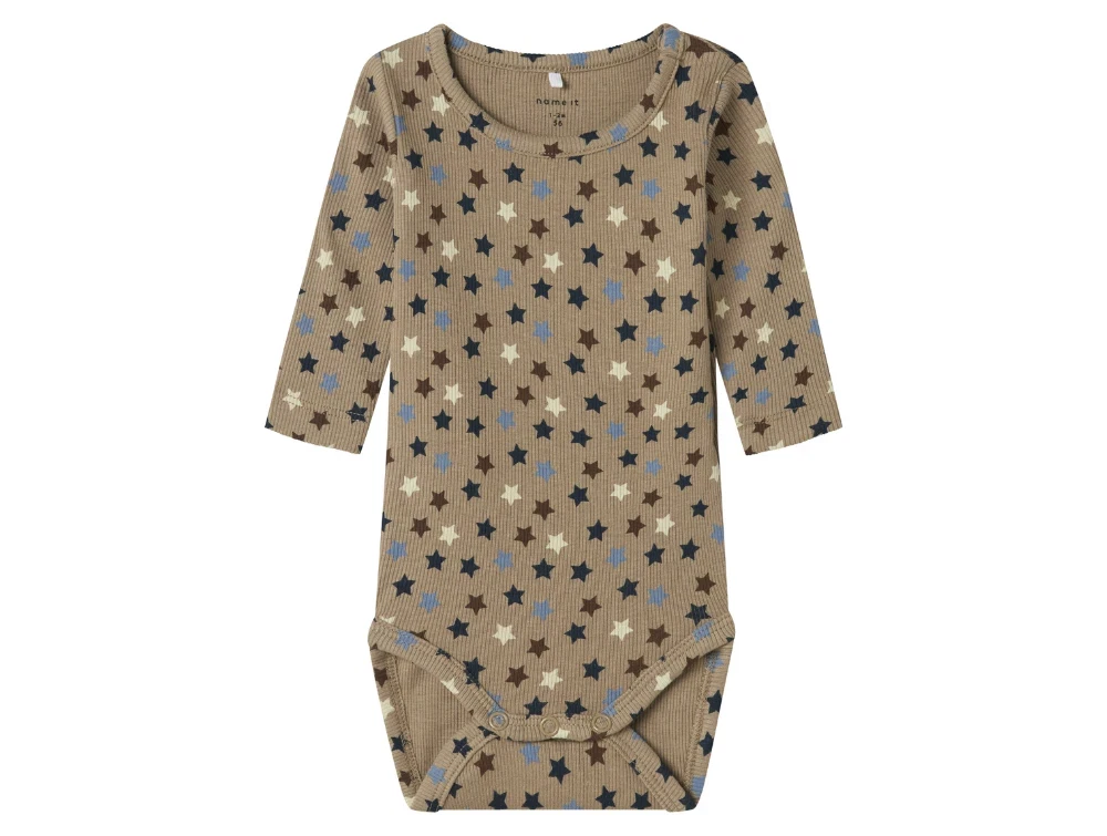 Langærmet body i en lys brun nuance med print af stjerner i blå og brune toner. Lavet i en blød og strækbar ribkvalitet, som føles behagelig mod huden. Bodyen har trykknapper ved halsudskæringen og i bunden, som gør den nem at få af og på.
