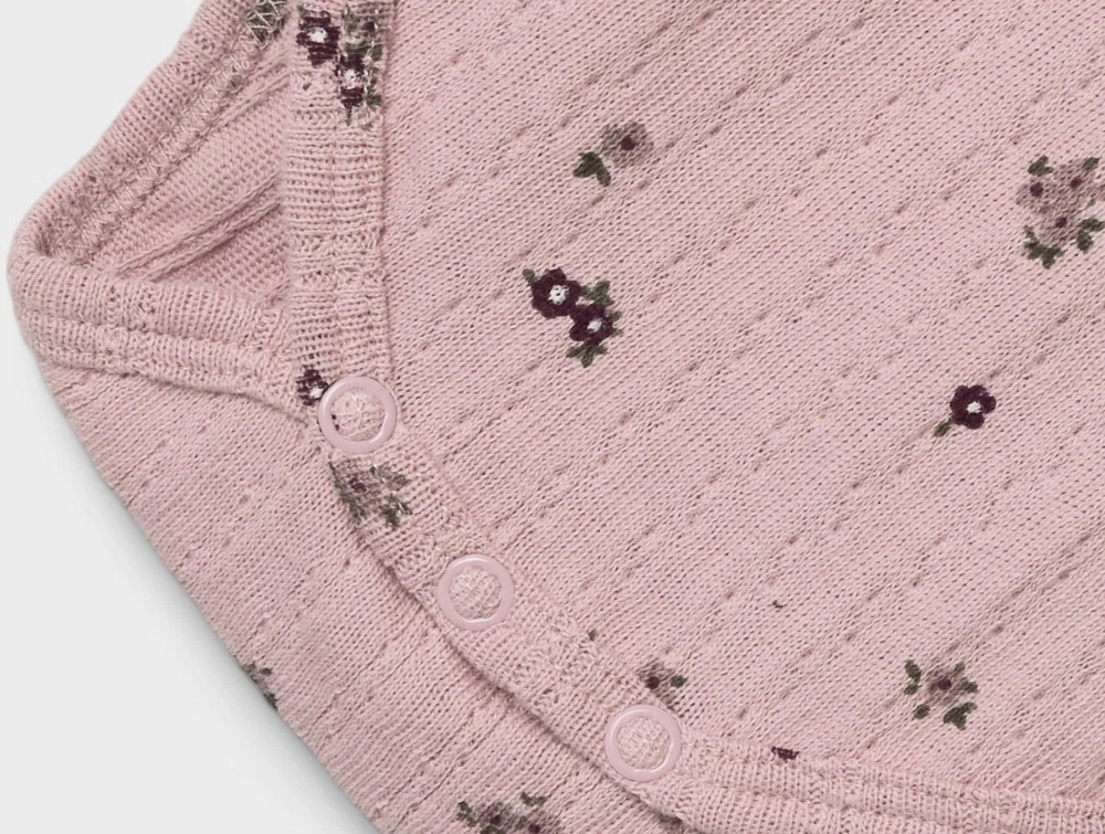 Body i rosa nuance fra Name It med små blomsterprint over hele stoffet. Den fine pointelle-struktur giver et feminint udtryk, mens den bløde kvalitet sikrer høj komfort for baby.