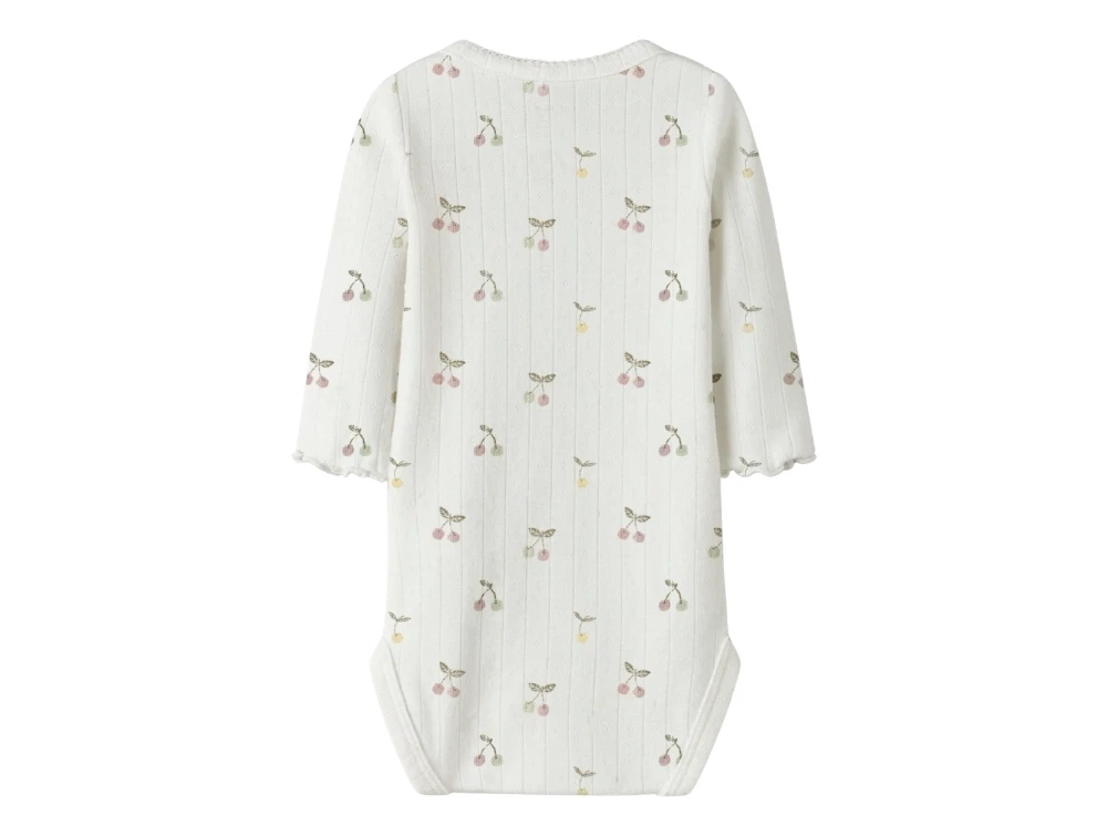 Body i råhvid nuance (Cloud Dancer) fra Name It med fint kirsebærprint og ribstruktur.