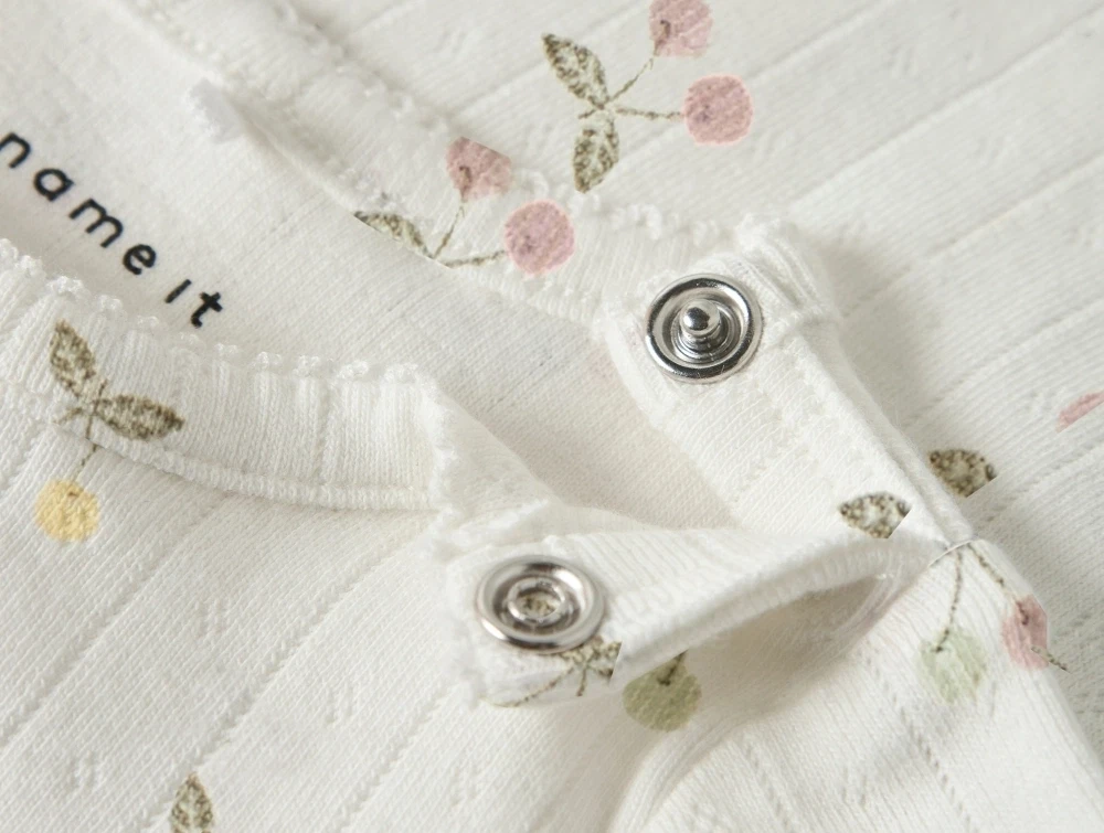 Baby iklædt Name It body i råhvid nuance med kirsebærprintName It body i råhvid nuance med kirsebærprintName It rib body i råhvid nuance med trykknapper ved skulderName It langærmet body i råhvid nuance set bagfra