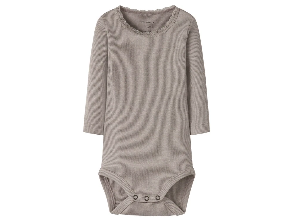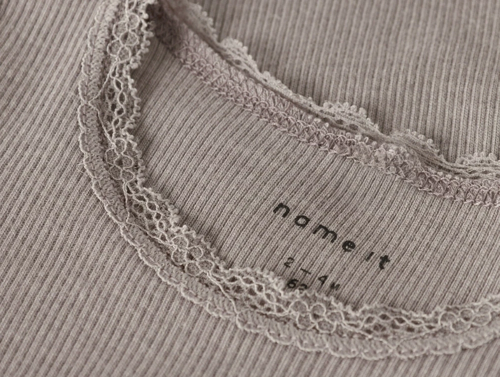 Ribstrikket body i grå nuance fra Name It med fin blondekant ved halsen. En klassisk basisstyle til baby, der kombinerer blød komfort og enkel elegance.