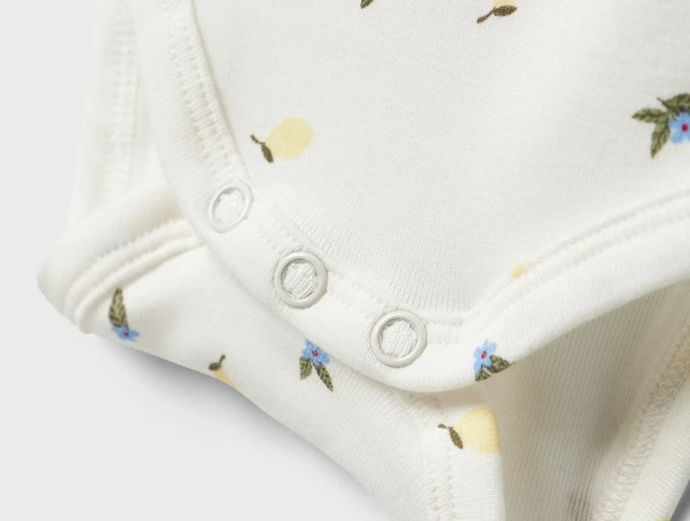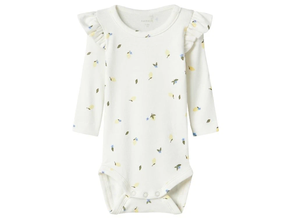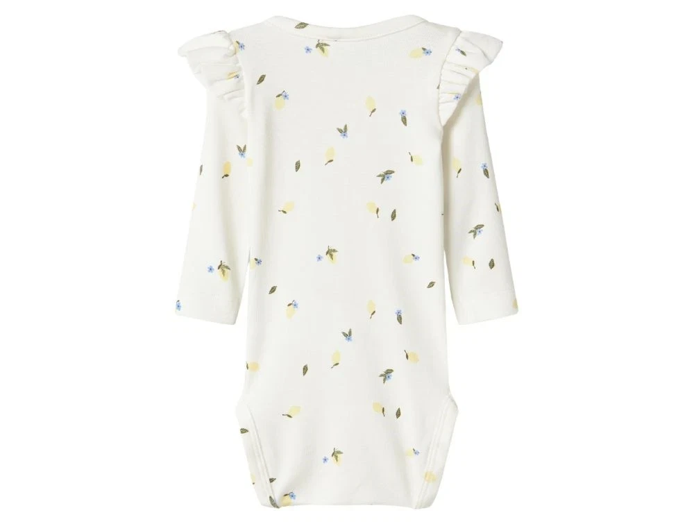 Langærmet body i en hvid nuance med fint print af små blå og gule blomster. Bodystockingen har rund hals, søde flæser over skuldrene og trykknapper på skulderen og mellem benene, som gør den nem at tage af og på. Den bløde og strækbare kvalitet gør bodyen behagelig at have på og oplagt til daglig brug.