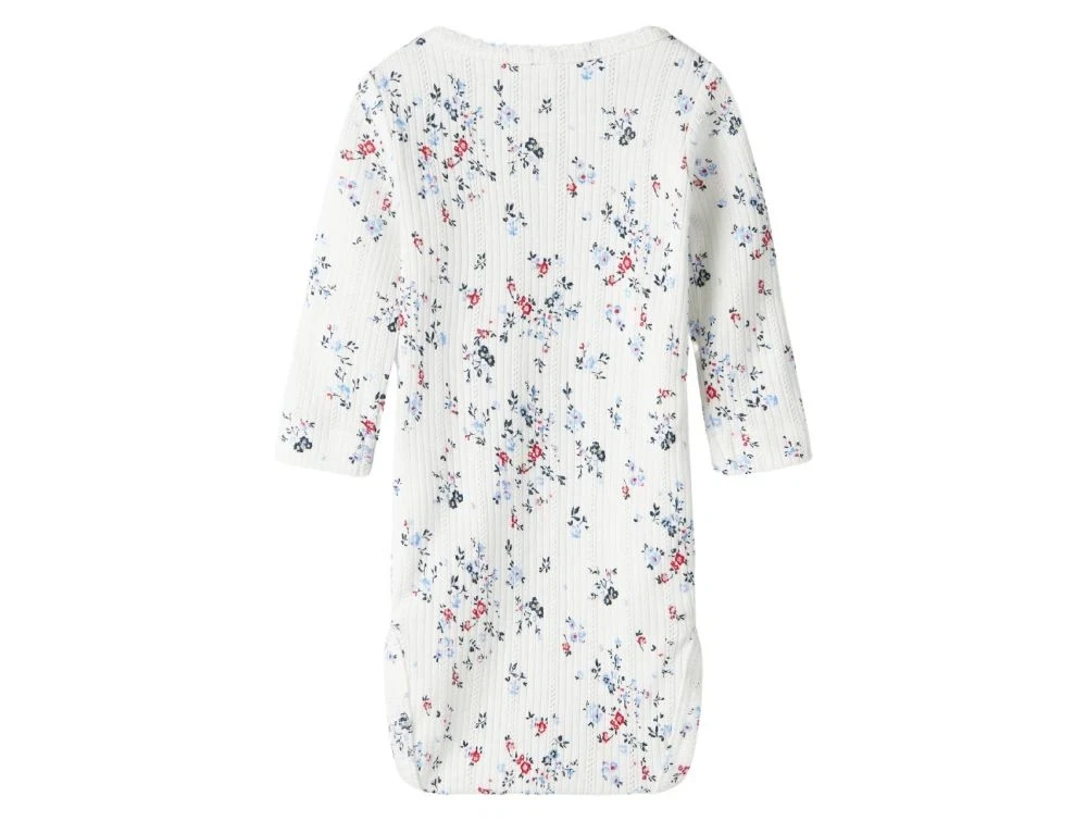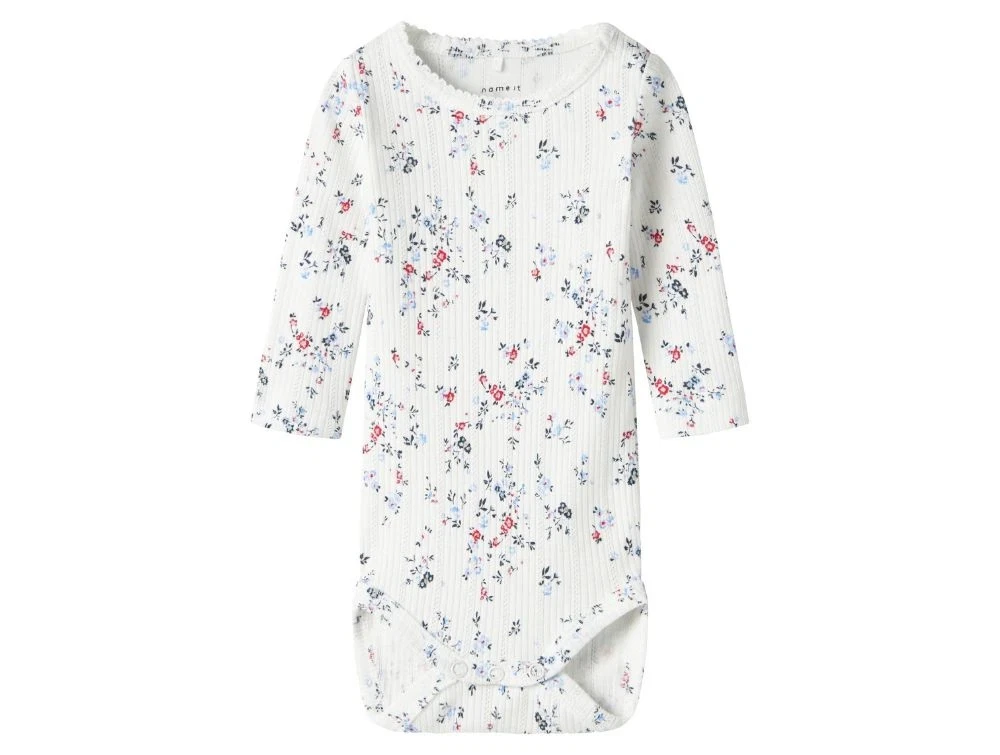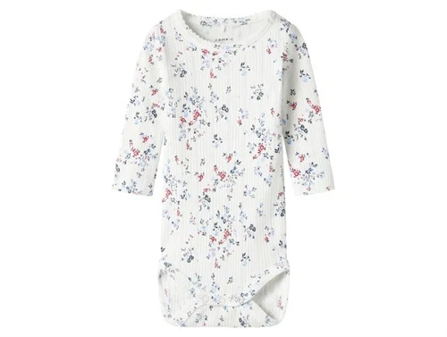 Hvid langærmet baby body med blåt og rødt blomsterprint fra Name It 13241122 cloud dancerHvid langærmet baby body med blåt og rødt blomsterprint fra Name It 13241122 cloud dancer bagfraLille pige klædt i hvid langærmet baby body med blåt og rødt blomsterprint fra Name It 13241122 cloud dancerTrykknaplukning i bunden af hvid baby body med blåt og rødt blomster print fra Name It 13241122 cloud dancer