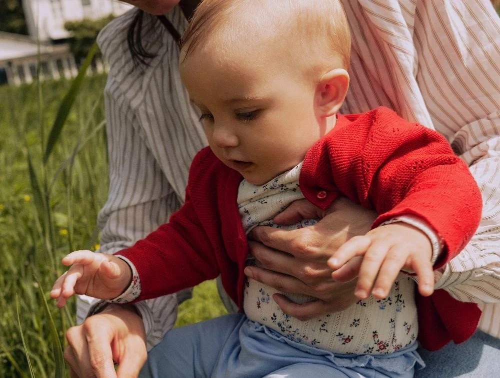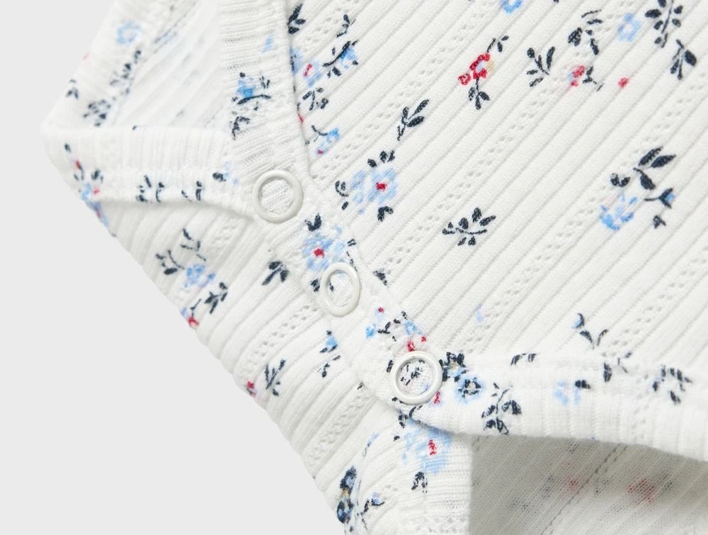 Body i en blød og strækbar kvalitet med fint vertikalt hulmønster og blomsterprint i lyseblå, mørkeblå og røde nuancer. Bodystockingen har rund hals med delikat tungekant og lange ærmer. Trykknapper på skulderen og mellem benene gør det nemt at få bodyen af og på. En let og sød style til de mindste.