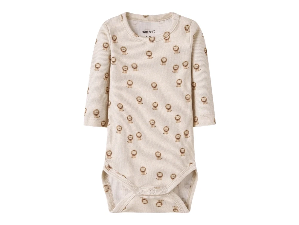 Body i beige nuance (Peyote Melange) fra Name It med print små løver og ribstruktur.