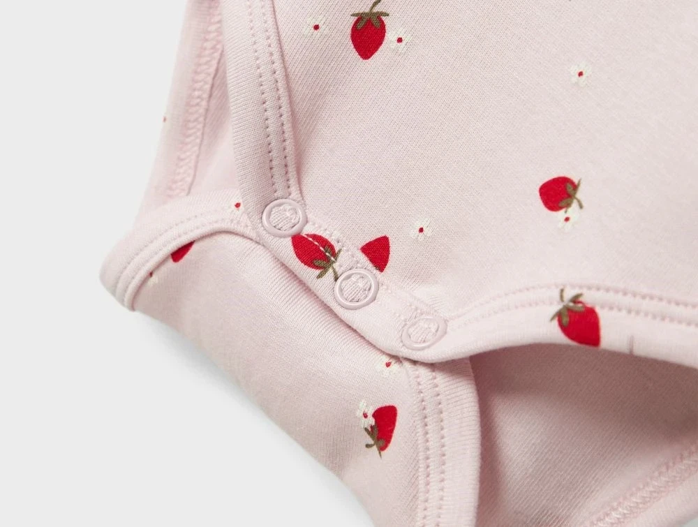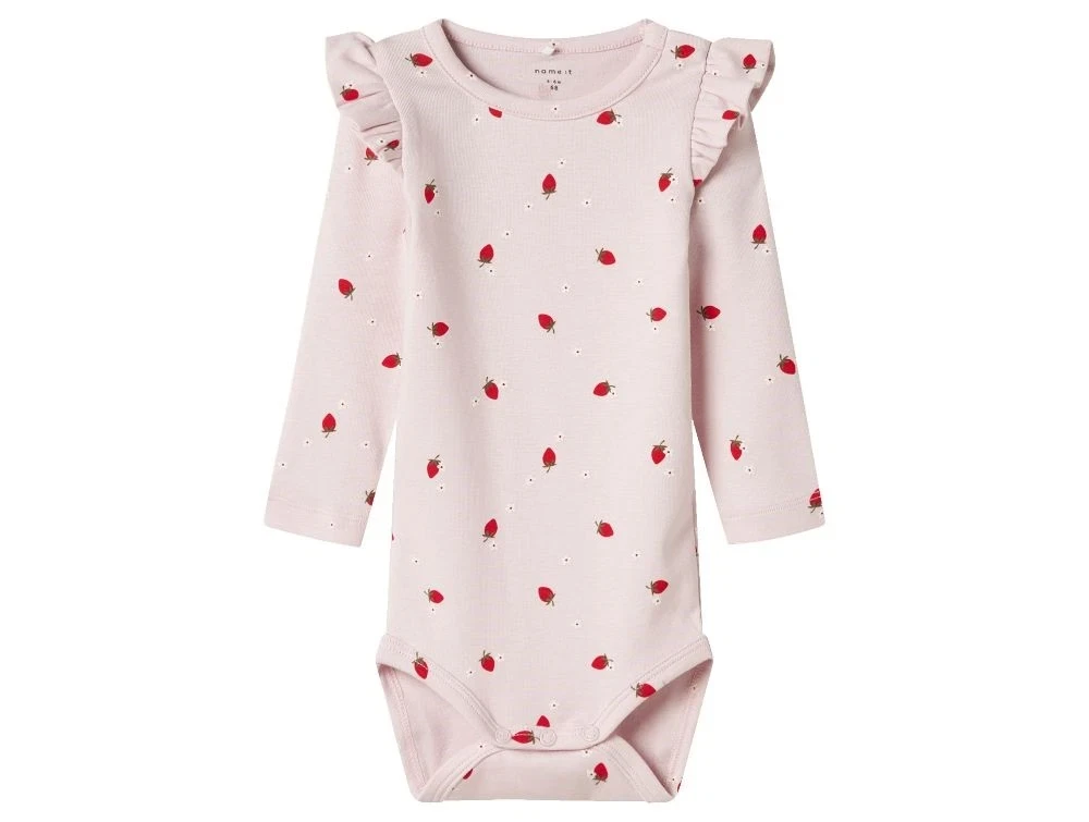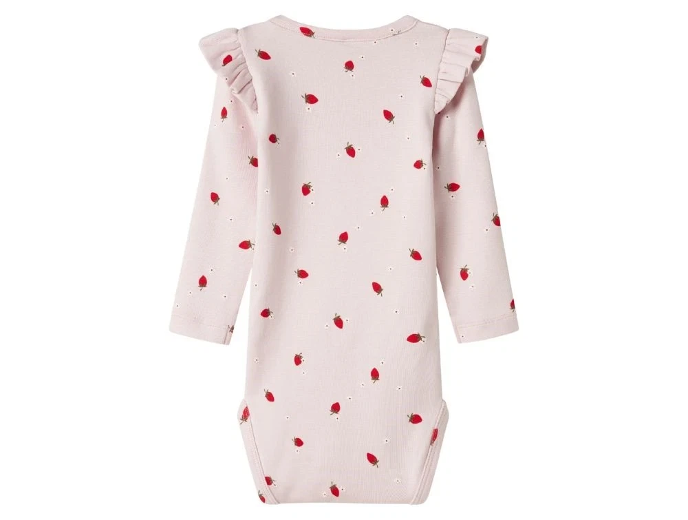 Langærmet body i en lyserød nuance med fint print af små røde jordbær og hvide blomster. Bodystockingen har rund hals, søde flæser over skuldrene og trykknapper på skulderen og mellem benene, som gør den nem at tage af og på. Den bløde og strækbare kvalitet gør bodyen behagelig at have på og oplagt til daglig brug.
