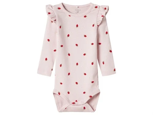 Lyserød langærmet baby bodystocking med print af små jordbær og flæser på skuldrene fra Name It 13241106 Light Lilac Lyserød langærmet baby bodystocking med print af små jordbær og flæser på skuldrene fra Name It 13241106 Light Lilac bagfraTrykknaplukning i bunden af lyserød langærmet baby bodystocking med print af små jordbær fra Name It 13241106 Light Lilac