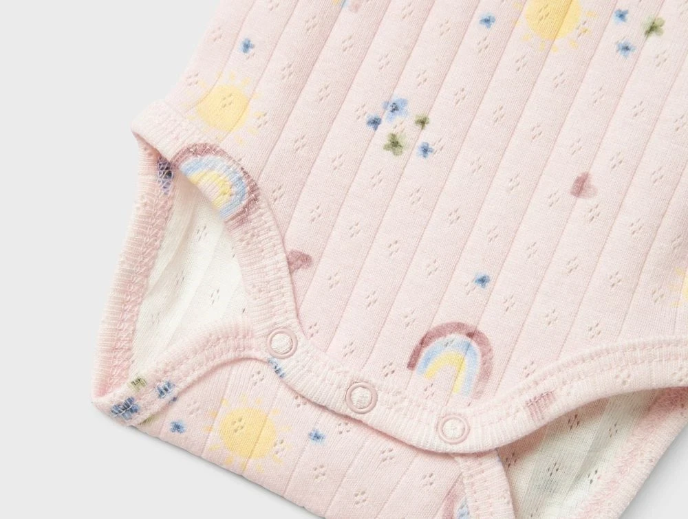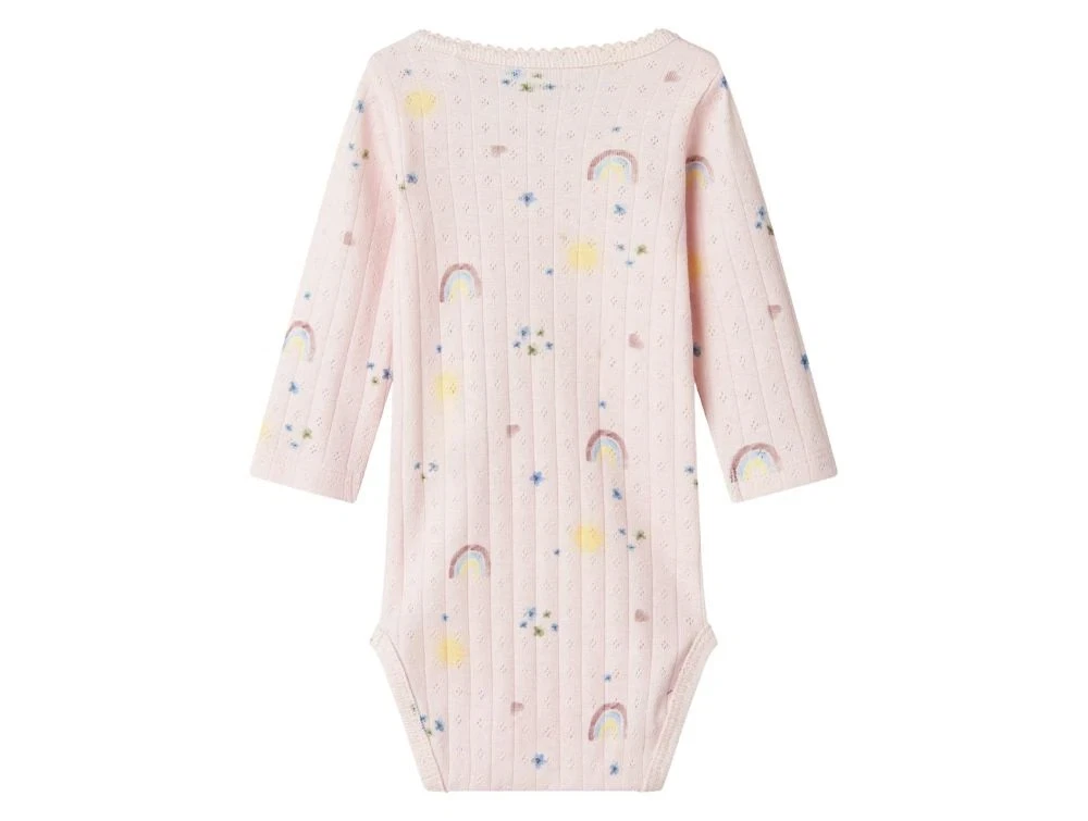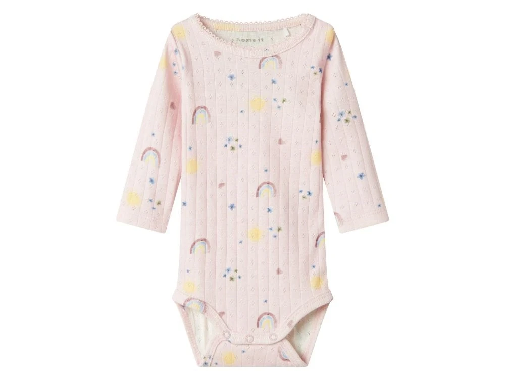 Blød og strækbar body i en lyserød nuance med sødt print af regnbuer, sole, blomster og små hjerter. Bodyen har et fint vertikalt hulmønster, rund hals med delikat tungekant og lange ærmer. Trykknapper på skulderen og mellem benene gør det nemt at tage bodyen af og på. En behagelig og sød style til brug året rundt.