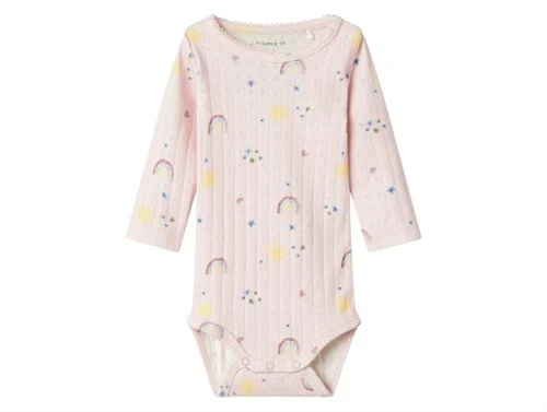 Lyserød  hulmønsteret body medprint af regnbuer, sole, hjerter og blomster fra Name It 13241099 light lilacLyserød  hulmønsteret body medprint af regnbuer, sole, hjerter og blomster fra Name It 13241099 light lilac bagfraKnaplukning i bunden på lyserød hulmønsteret body medprint af regnbuer, sole, hjerter og blomster fra Name It 13241099 light lilac