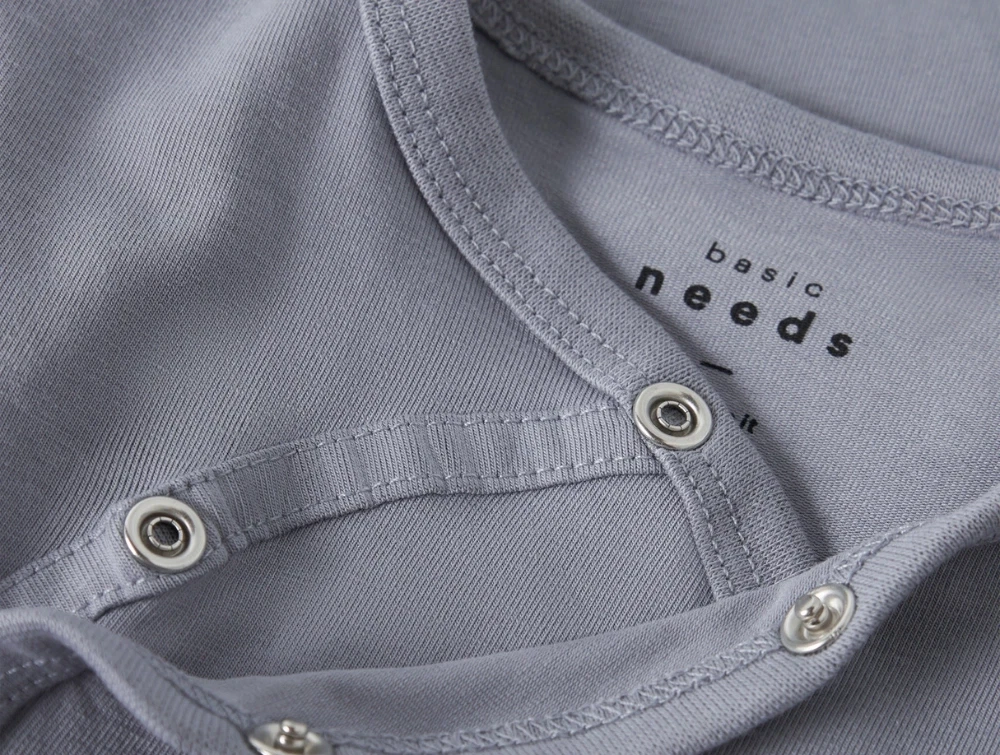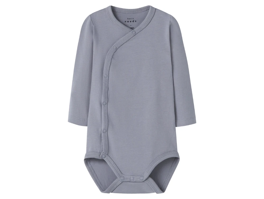 Body i lyseblå nuance (tradewinds) fra Name It med praktisk slå-om lukning. Modellen har lange ærmer og trykknapper foran og forneden, som gør det nemt at tage af og på.