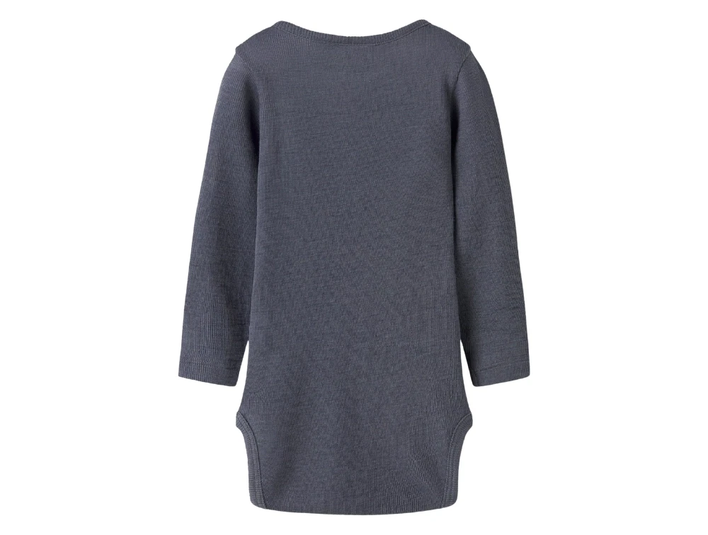 Body i blågrå nuance (folkstone gray) fra Name It i en luksuriøs blanding af merinould og silke.