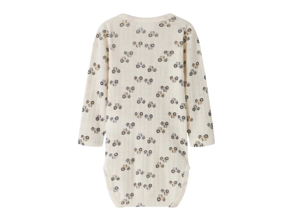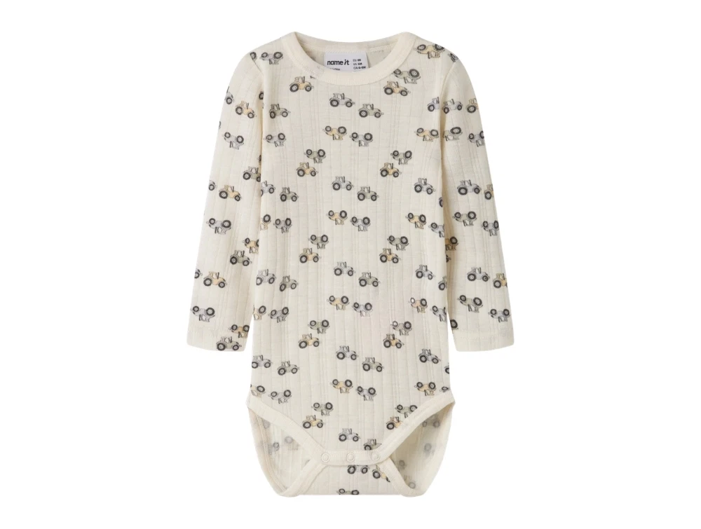 Body i råhvid nuance (coconut milk) fra Name it med traktorprint og lange ærmer.