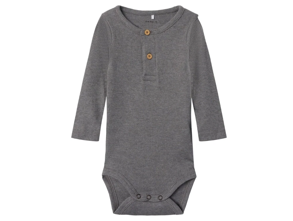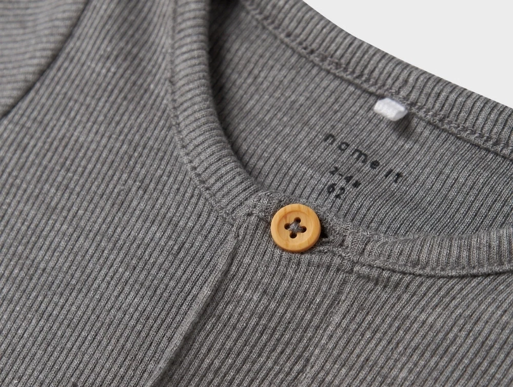 Ribstrikket body i mørkegrå nuance fra Name It. Bodyen har lange ærmer, rund hals og to træknapper foran, der gør den nem at tage af og på. Den bløde og strækbare kvalitet giver barnet god bevægelsesfrihed og komfort hele dagen.