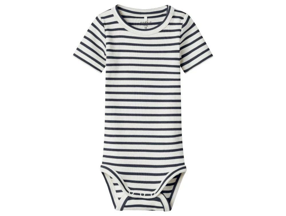 Blød og strækbar kortærmet body fra Name It med fine klassiske striber i mørkeblå og hvid. Bodystockingen er lavet i ribstrik af en blanding af økologisk bomuld, modal og elastan, der sikrer en behagelig pasform og god bevægelsesfrihed til hverdagsbrug.
