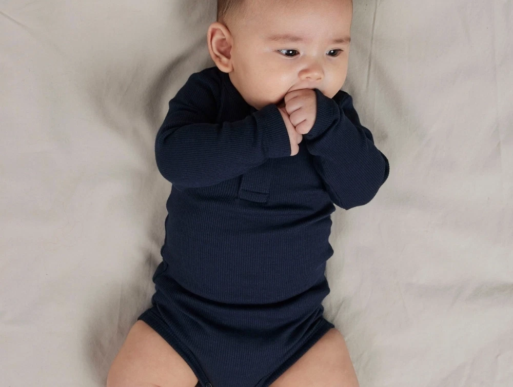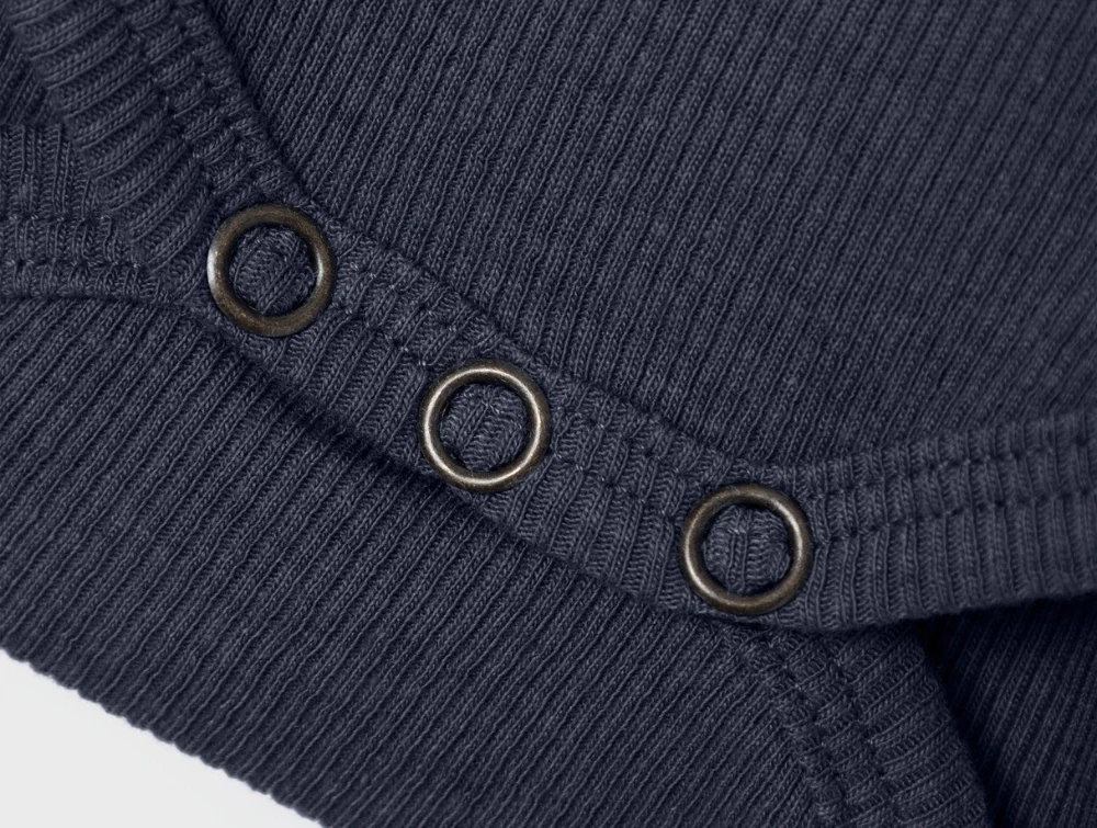 Ribstrikket body i mørkeblå nuance fra Name It. Bodyen har lange ærmer, rund hals og små træknapper foran, som giver et klassisk og enkelt udtryk. Den bløde og strækbare kvalitet gør den behagelig for barnet og ideel til brug året rundt.