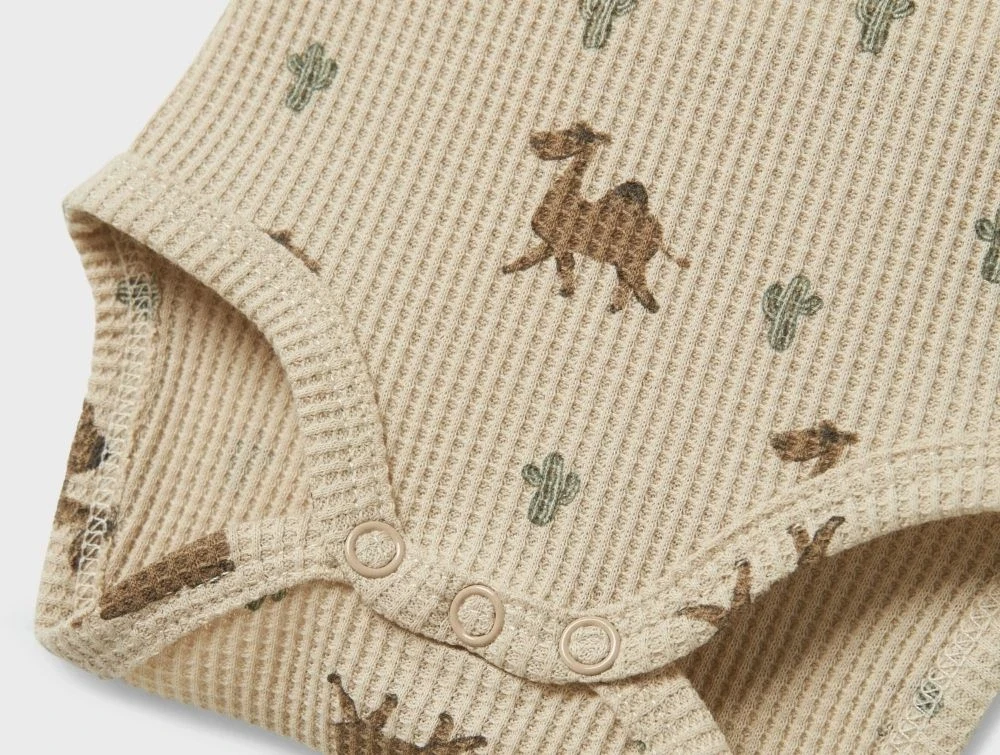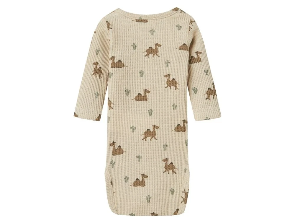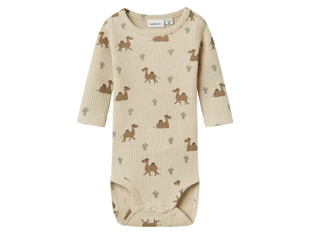Body i beige (peyote) fra Name It med alloverprint af dromedarer og små kaktusser.