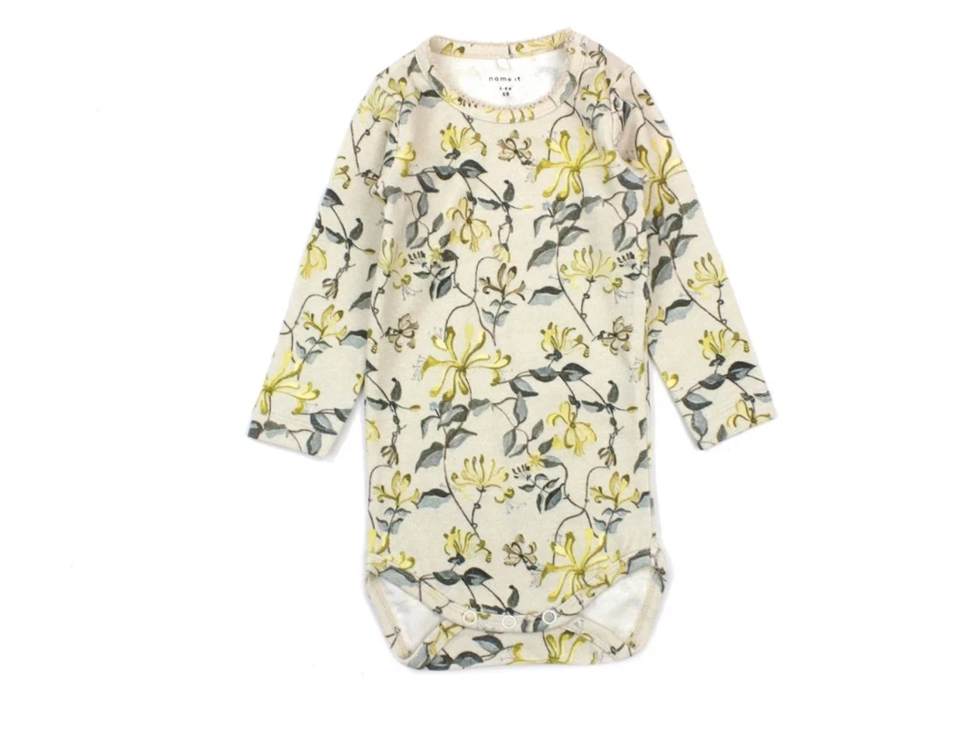 Body i økologisk bomuld i farven peyote melange med blomsterprint fra Name It.