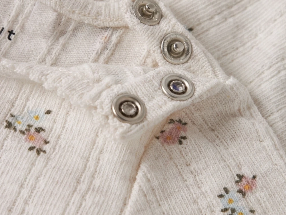 Body i råhvid nuance fra Name It med små blomsterprint over hele stoffet. Den fine pointelle-struktur giver et sødt og feminint udtryk, mens materialet føles blødt mod babyens hud.