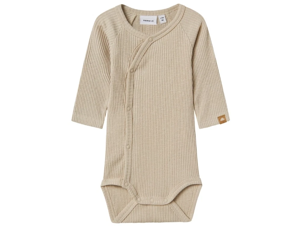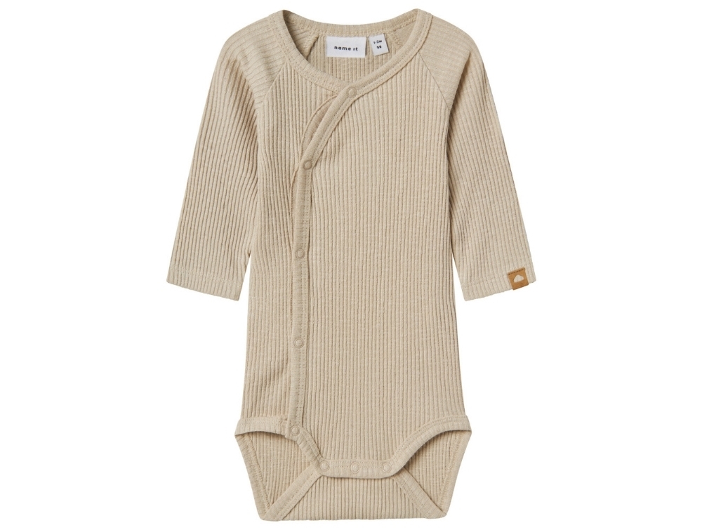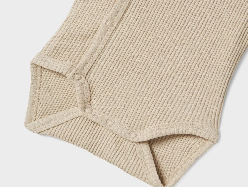 Body i beige nuance fra Name It i blød ribkvalitet. Det strækbare stof giver en behagelig pasform og gør den nem at bevæge sig i. En klassisk basisstyle til hverdagsbrug.