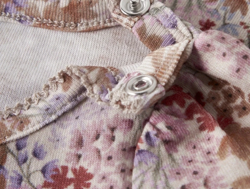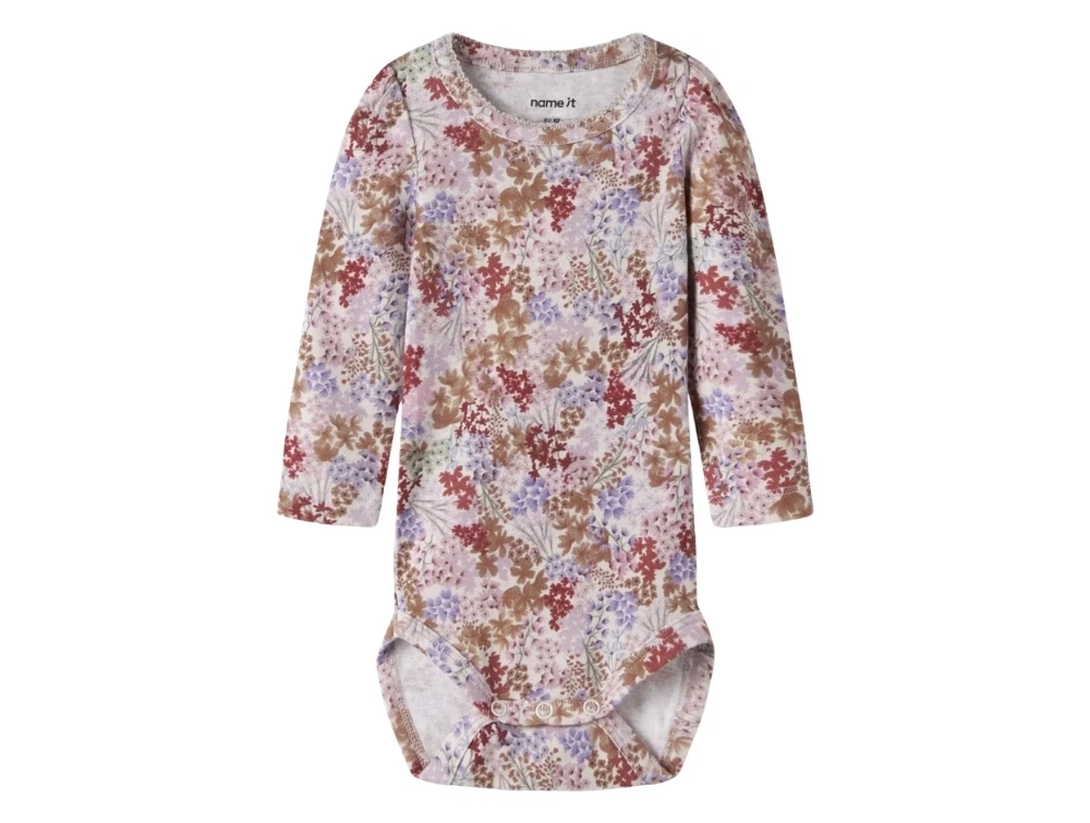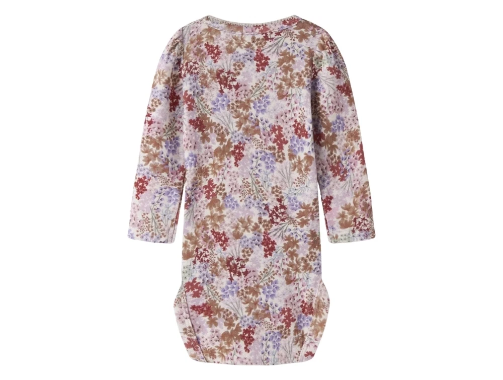 Body i lys beige nuance (pumice stone) fra Name It med multifarvet blomsterprint i rosa, lilla og brune toner.