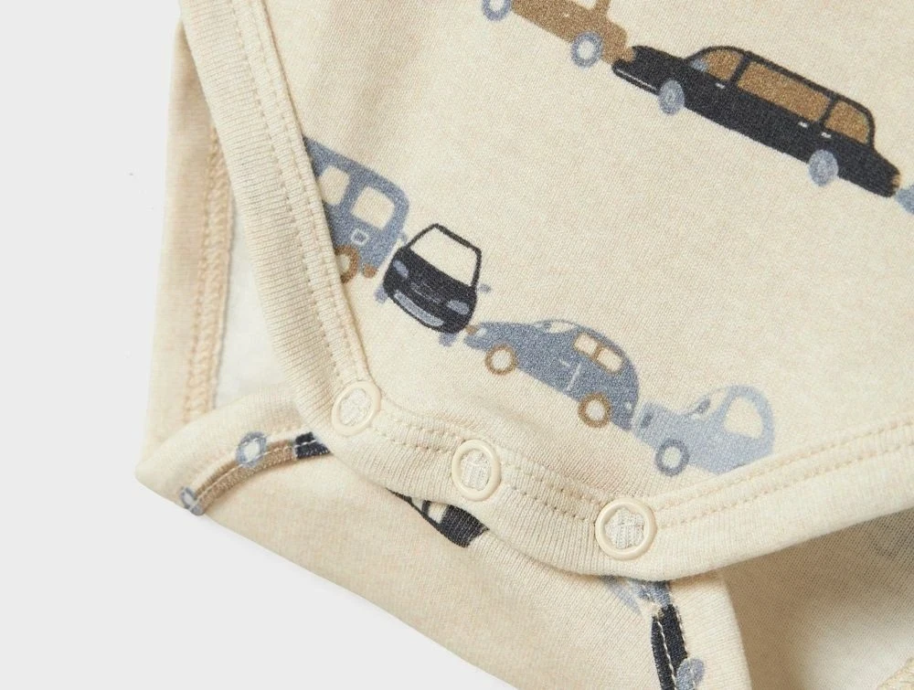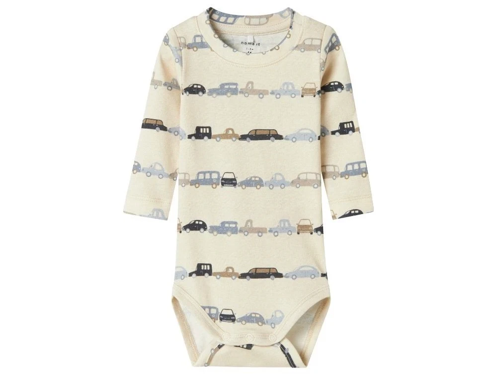 Blød og behagelig body med lange ærmer i en flot råhvid nuance. Bodyen har et print af biler og lukkes med praktiske trykknapper forneden.