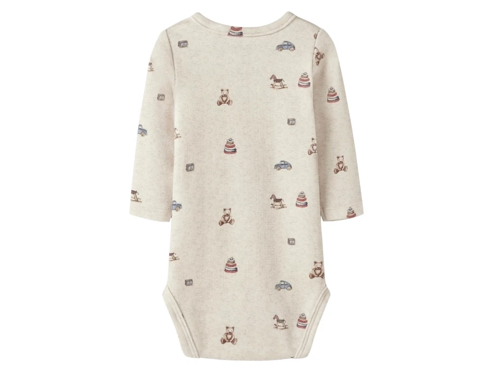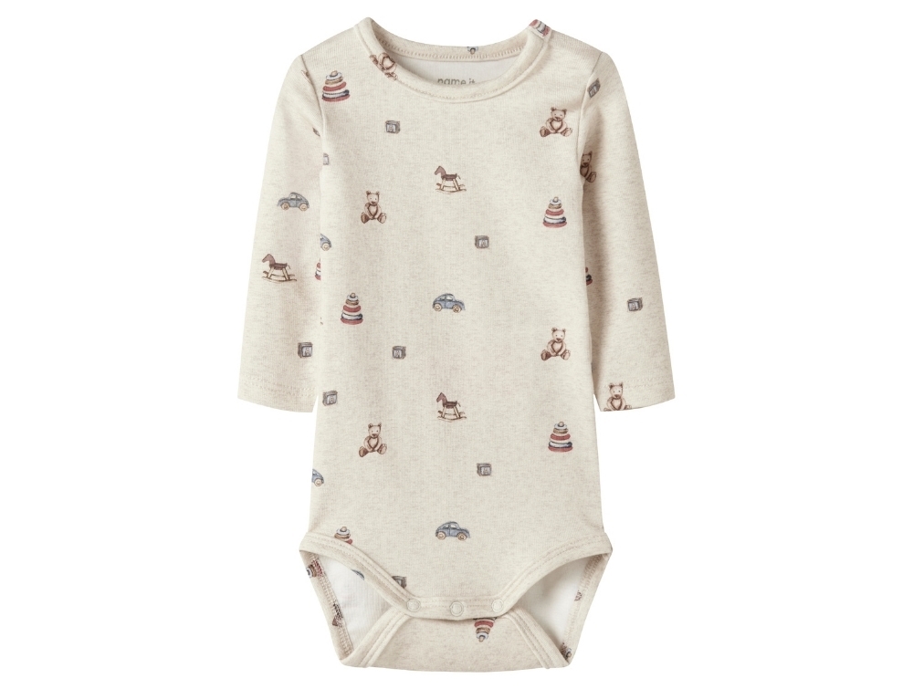 Body i råhvid nuance (peyote melange) fra Name It i ribstrikket kvalitet med allover-print af klassisk legetøj som bamser, biler og stabletårne.