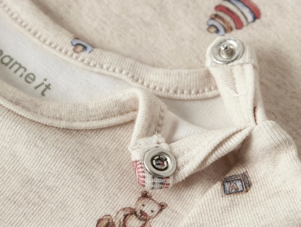 Name It body råhvid peyote melange i rib med legetøjsprint foranDetalje af trykknapper på råhvid rib body fra Name ItName It body råhvid peyote melange med allover legetøjsprint set bagfra