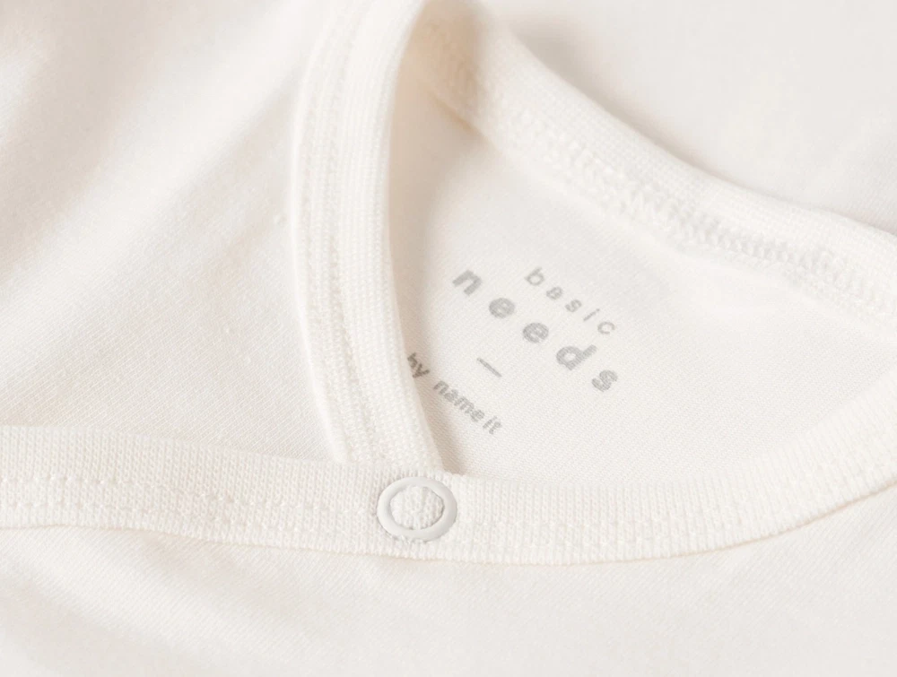 Body i råhvid nuance (cloud dancer) fra Name It med praktisk slå-om lukning. Modellen har lange ærmer og trykknapper foran og forneden, som gør det nemt at klæde barnet på og skifte ble.