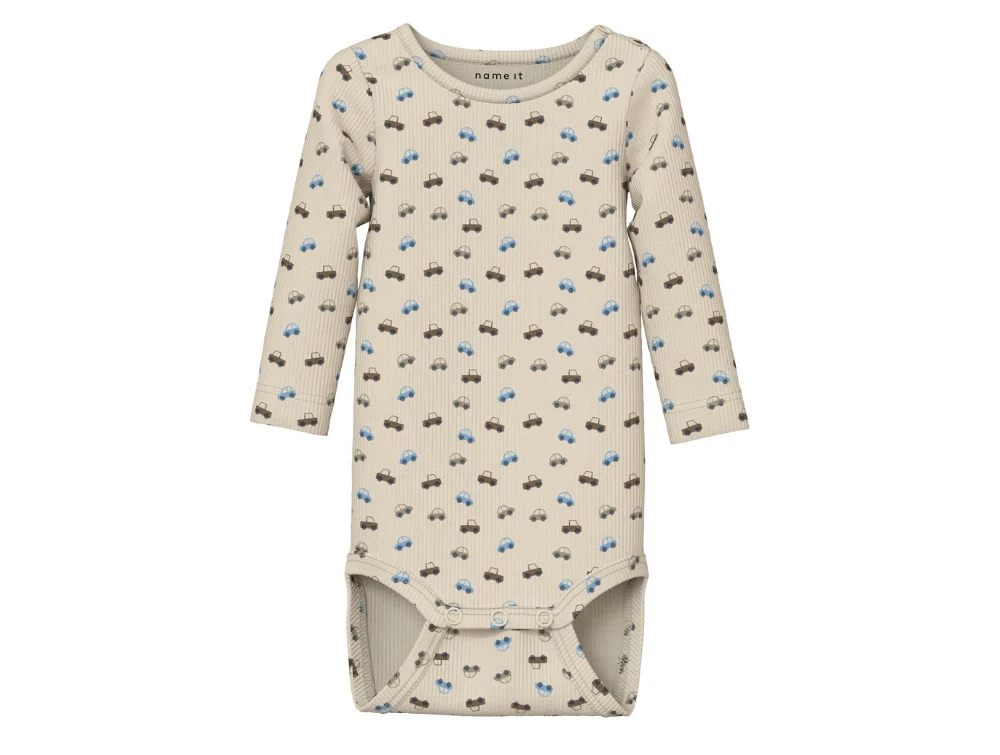 Langærmet body i blød ribkvalitet med et fint print af små biler i blå og brune nuancer. Bodyen har trykknapper i halsudskæringen og i bunden, som gør den nem at tage af og på. En komfortabel og strækbar style til hverdag.
