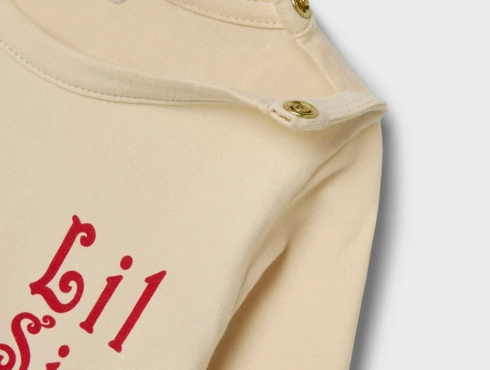 Bodyen har lange ærmer, en rund hals og trykknapper i bunden, som gør den nem at tage af og på. Det bløde pigmentprint sikrer en let og komfortabel fornemmelse mod huden. Perfekt som en sød gave til en ny lillesøster.