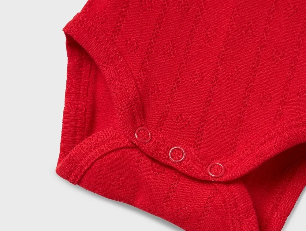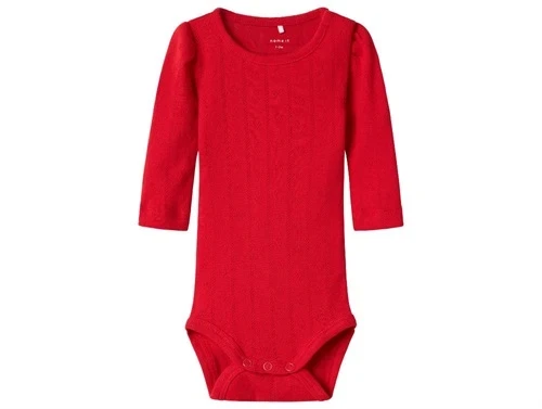 Blød og strækbar body fra Name It i en smuk rød nuance med fint pointellestrik, der skaber et dekorativt hulmønster med hjerter. En klassisk og praktisk style, der er perfekt til brug året rundt.