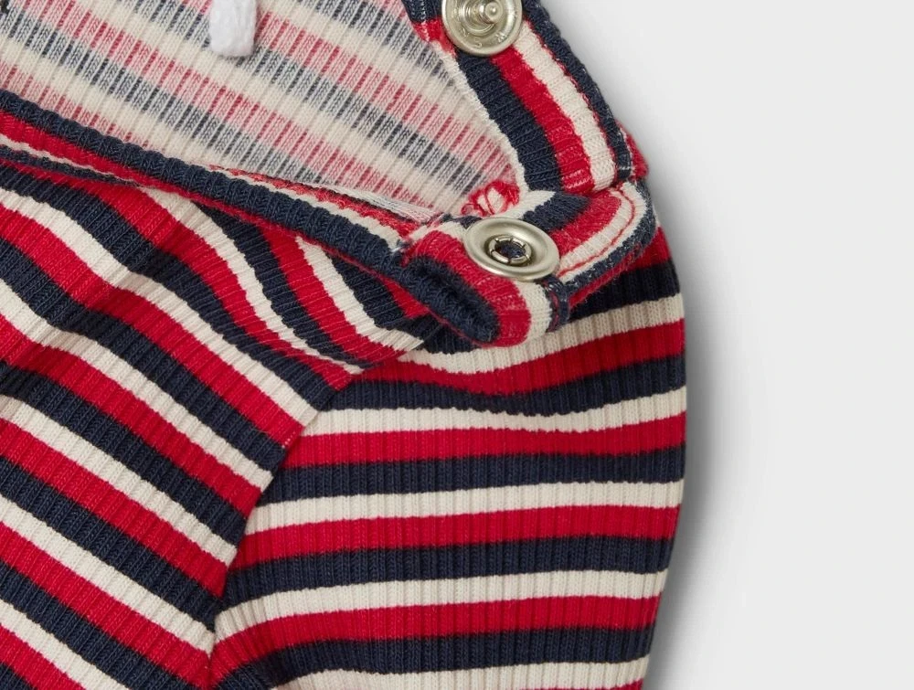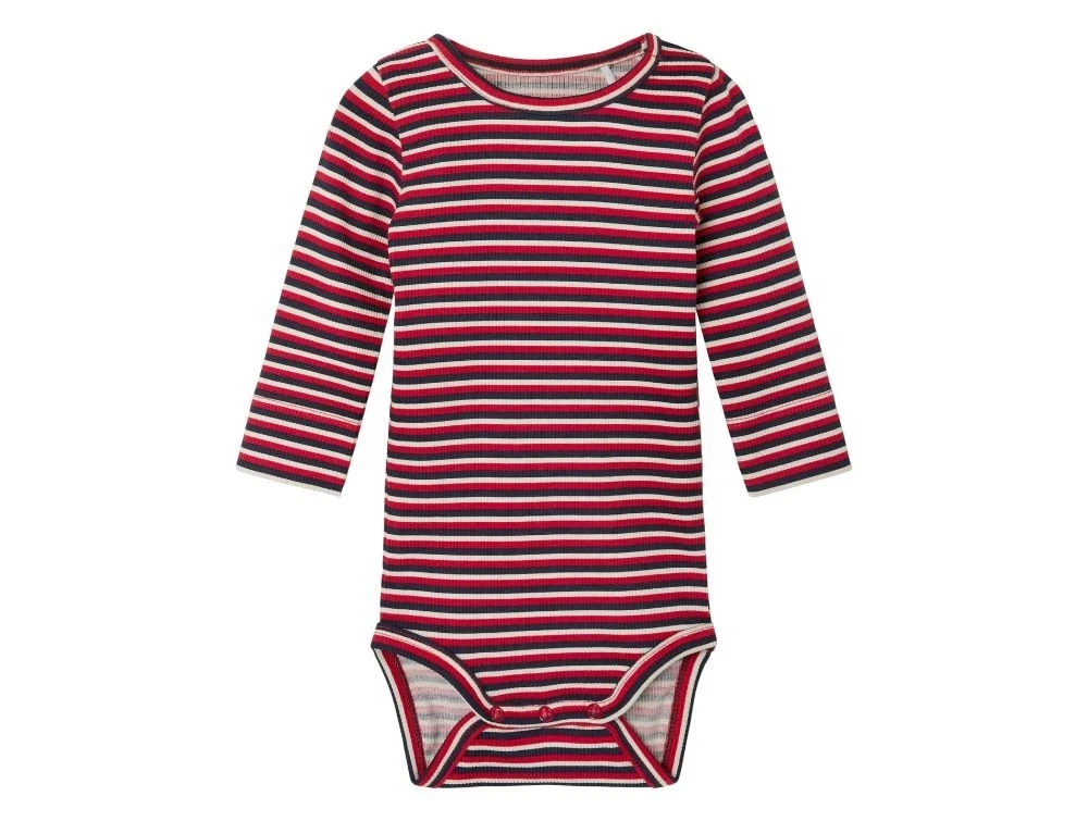 Blød og strækbar body fra Name It med striber. Den er lavet af 95% økologisk bomuld og 5% elastan, hvilket giver en behagelig og fleksibel pasform.