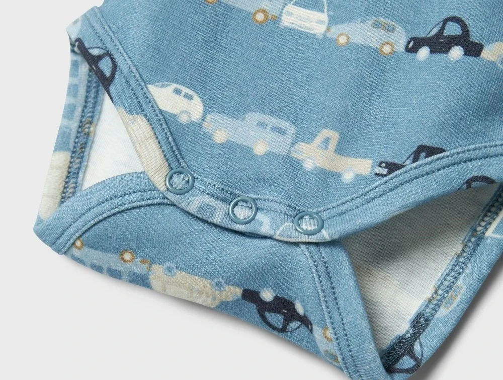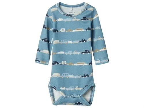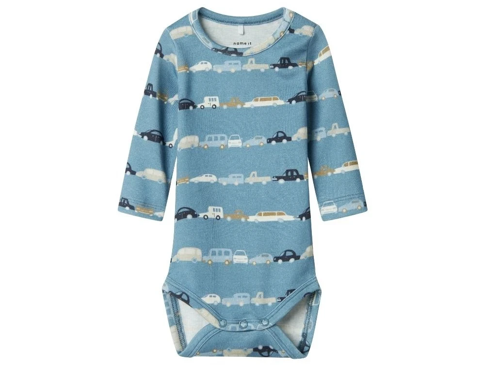 Blød og behagelig body med lange ærmer i en flot blå nuance. Bodyen har et print af biler og lukkes med praktiske trykknapper forneden.