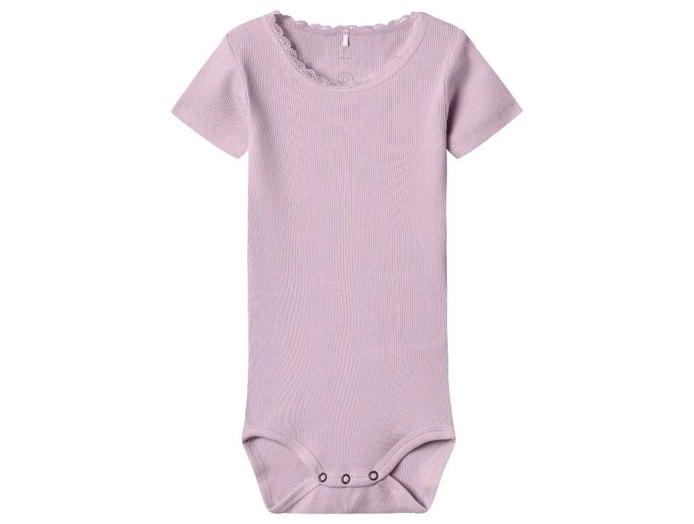 Kortærmet body i violet (winsome orchid) med blonde ved halsåbning fra Name It.