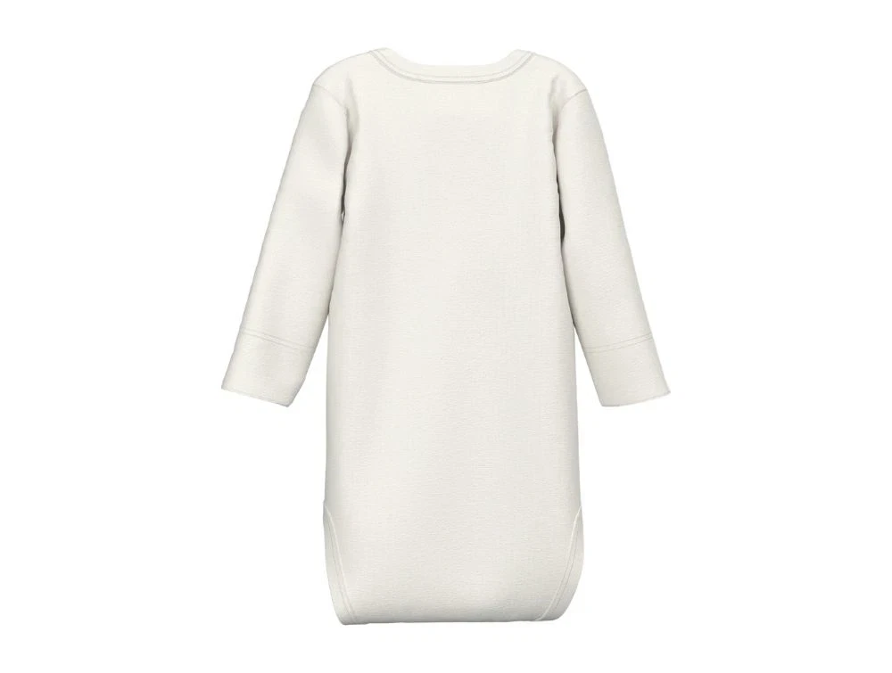 Blød og praktisk wrap-body i en fin hvid nuance. Modellen har lange ærmer og lukkes med trykknapper langs maven og forneden, hvilket gør den nem at tage af og på – især praktisk til de mindste.