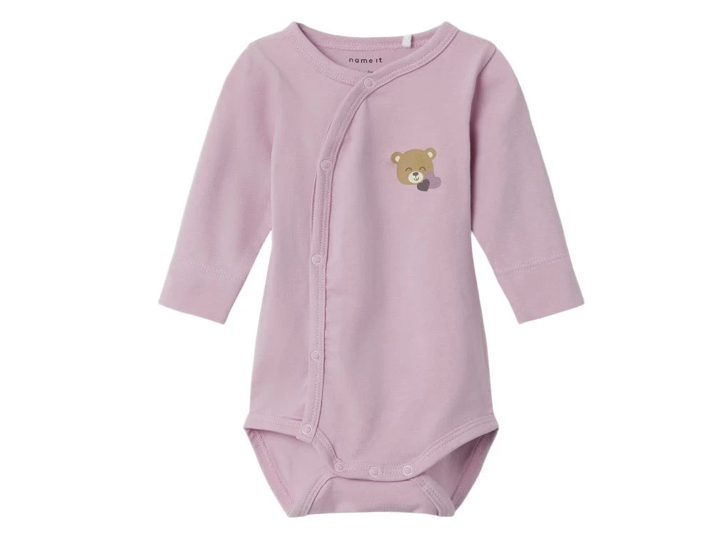 Blød og praktisk wrap-body i en smuk rosa nuance. Modellen har lange ærmer og lukkes med trykknapper langs maven og forneden, hvilket gør den nem at tage af og på – især praktisk til de mindste.