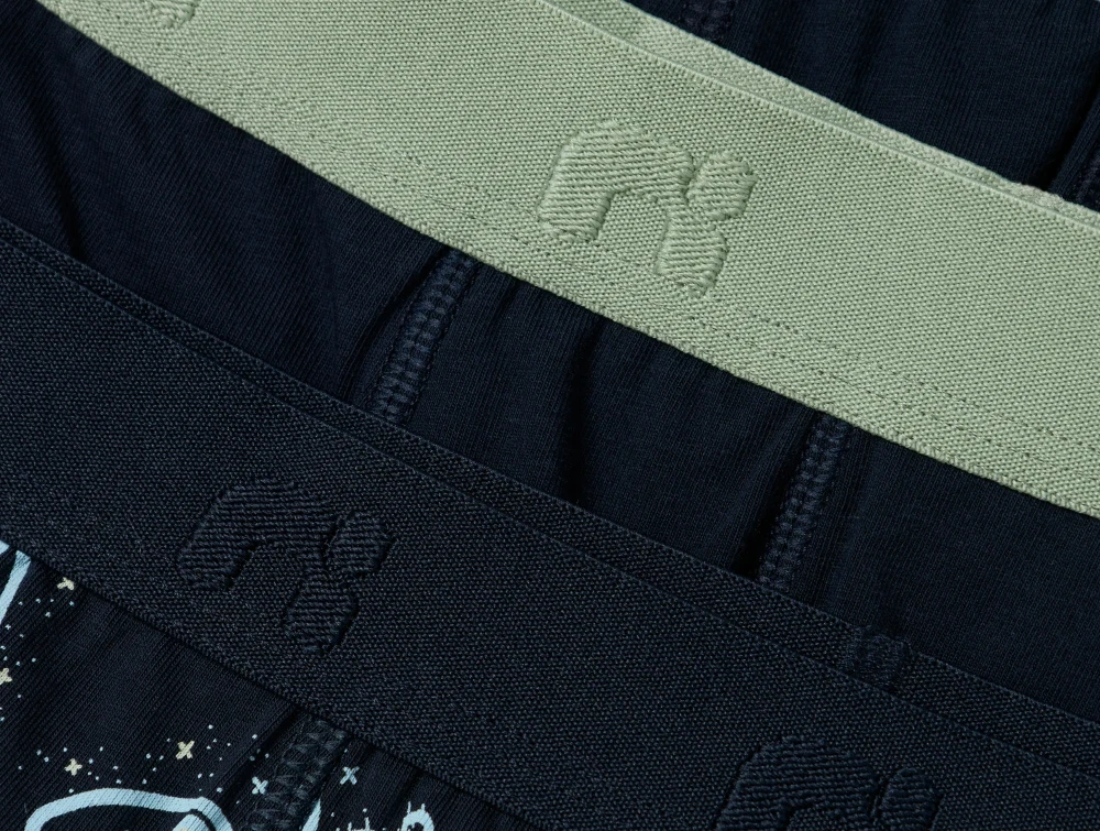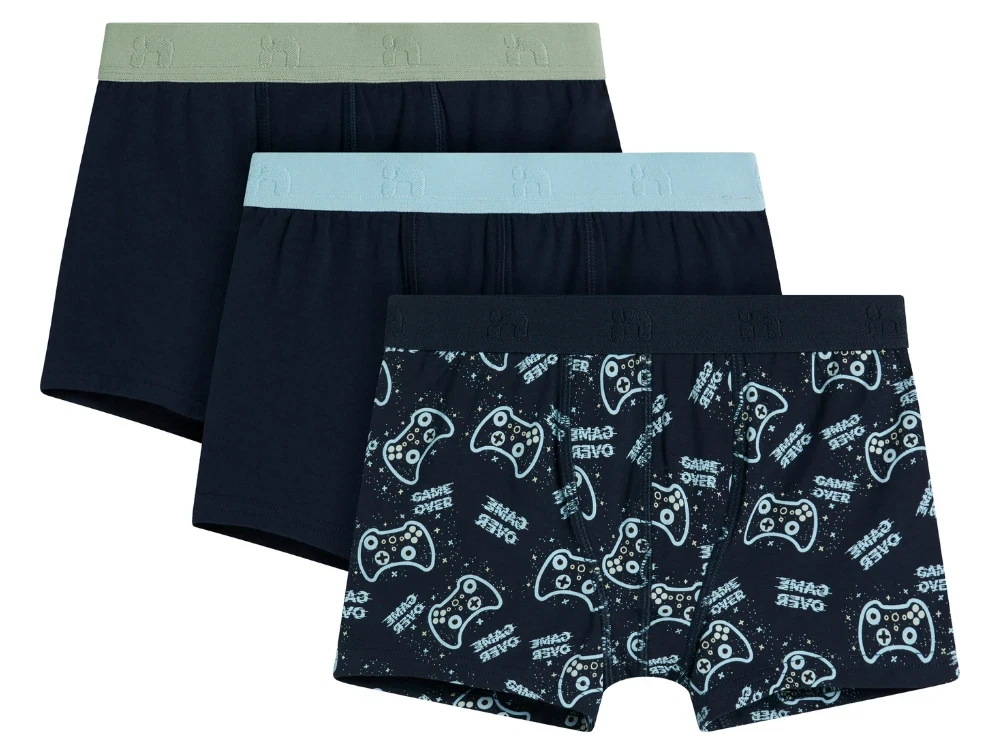 3-pak boxershorts fra Name It i dark sapphire med gamerprint og ensfarvede varianterNærbillede af linning og print på Name It boxershorts med gamer-tema