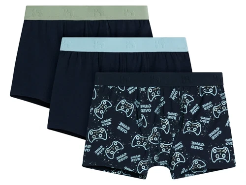 3-pak boxershorts fra Name It i mørk navy med gamerprint og kontrastfarvede elastikker.