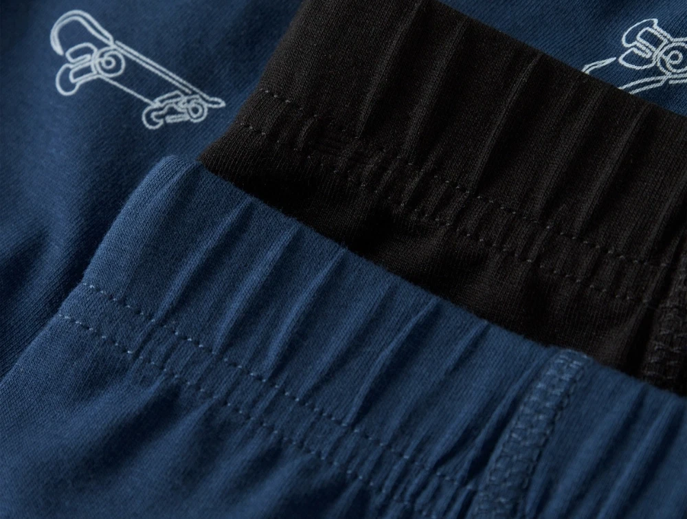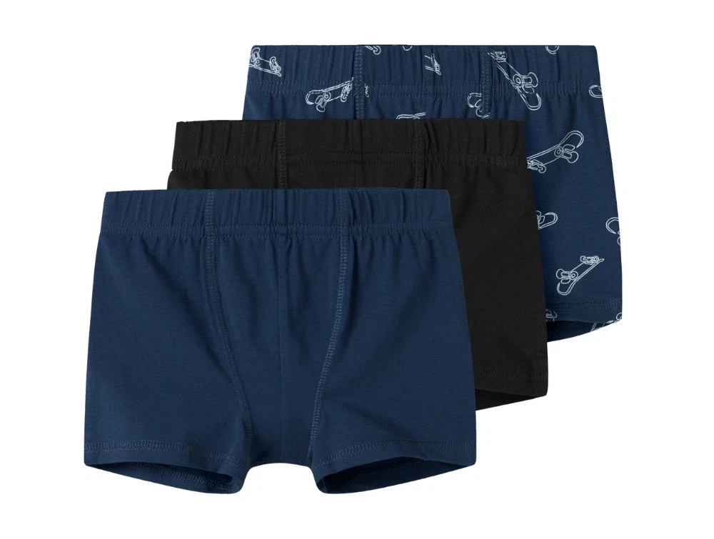 3-pak boxershorts i mørkeblå og sorte nuancer fra Name It. Sættet består af to ensfarvede og én med sejt skateboardprint. De er lavet i blød, økologisk bomuld med stræk for en god og behagelig pasform.