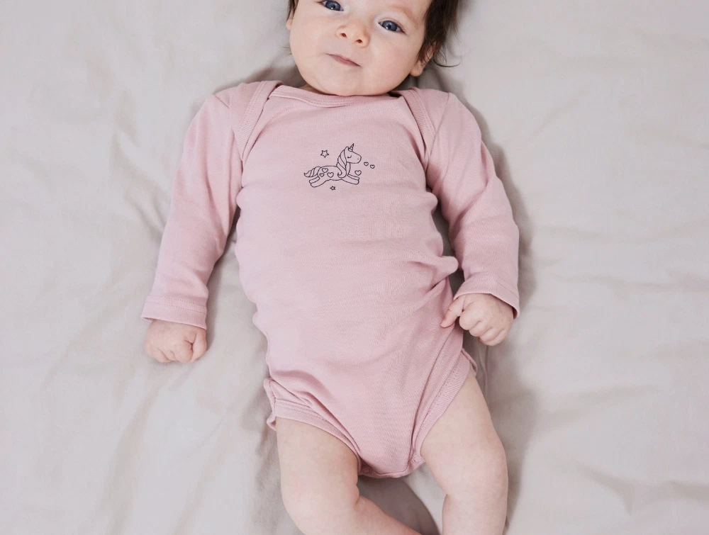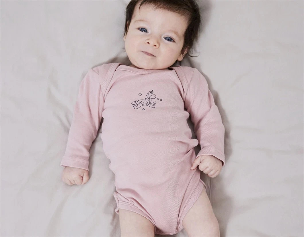 Den ene body er ensfarvet rosa med enhjørning-print på fronten, mens den anden body er hvid med enhjørning all-over print.