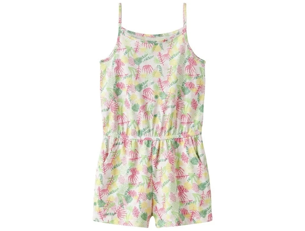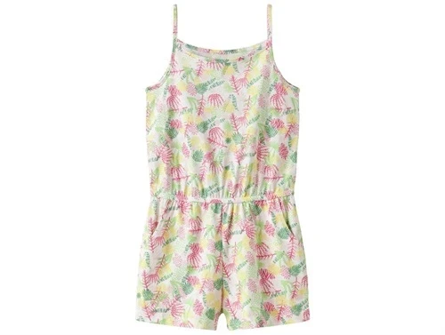 Dragten er designet til børn og har en afslappet pasform, elastik i taljen og korte ben, som giver masser af bevægelsesfrihed på varme dage. Det farverige tropiske print og de enkle stropper skaber et frisk og sommerligt udtryk, perfekt til solskinsdage og ferieeventyr.