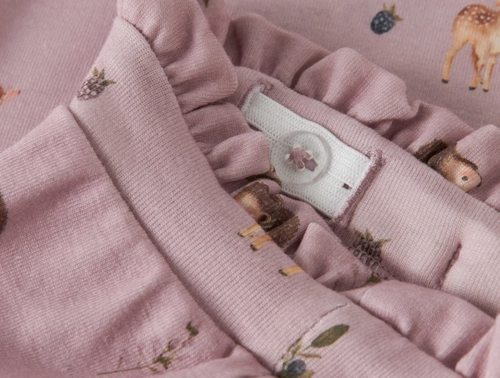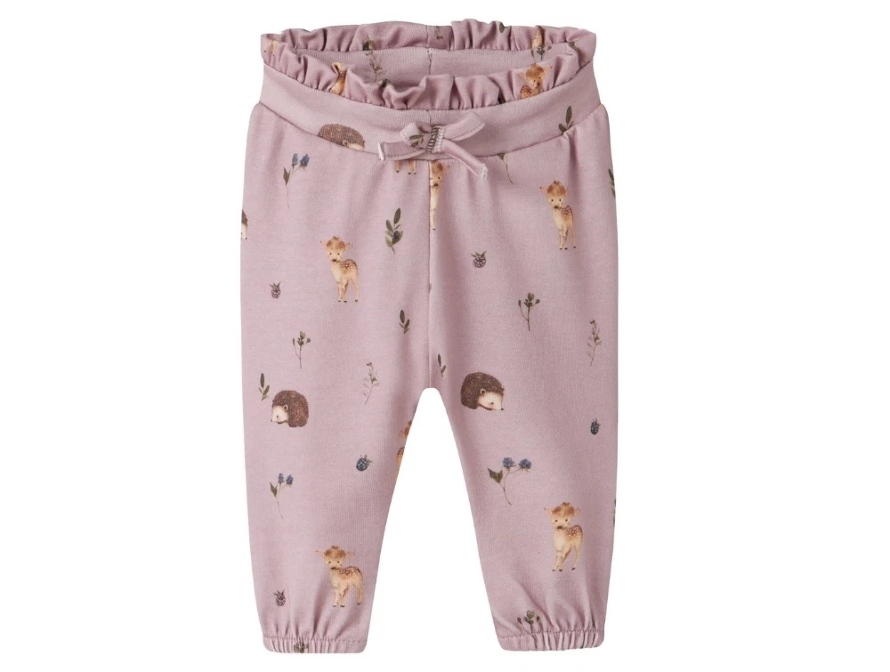 Bløde bukser i lys lilla nuance (burnished lilac) fra Name It med sødt print af rådyr, pindsvin og små bær. Bukserne har rynket talje med sløjfe og elastik forneden, der giver en fin pasform.