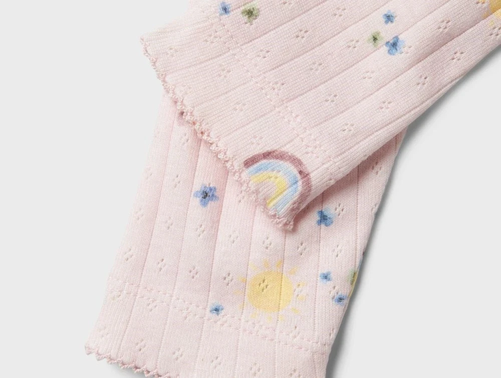 Bløde bukser i en lyserød nuance og en strækbar kvalitet med vertikalt hulmønster og print af regnbuer, sole, blomster og små hjerter. Modellen har en ekstra høj linning, der kan foldes ned og giver en blid pasform uden elastik – ideel til de mindste. Tungekant forneden tilføjer en fin afslutning.