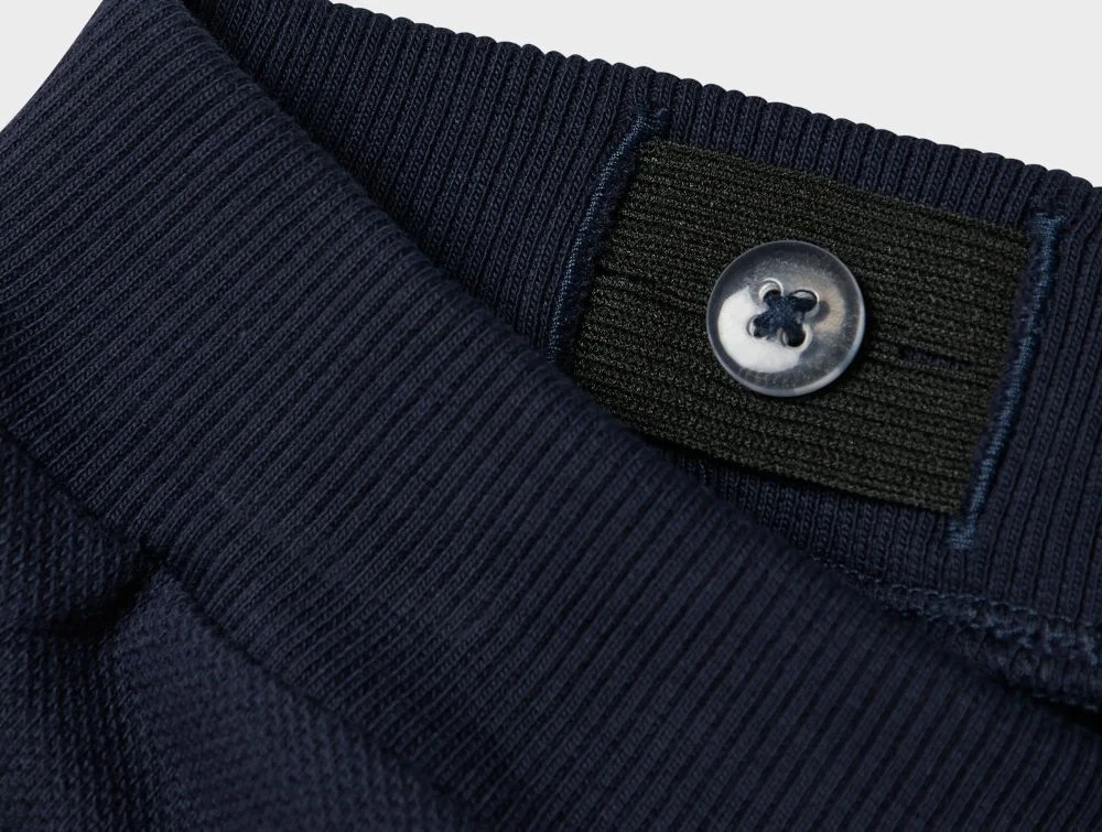 mørkeblå bukser fra name it med bindesnor og opsmøg, set forfrabagside af mørkeblå sweatbukser fra name it med baglommenærbillede af justerbar elastik i taljen på navy sweatbukser fra name it