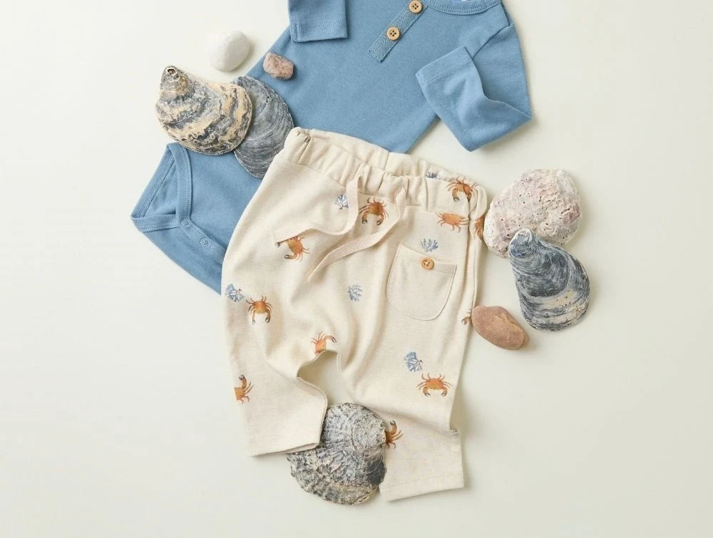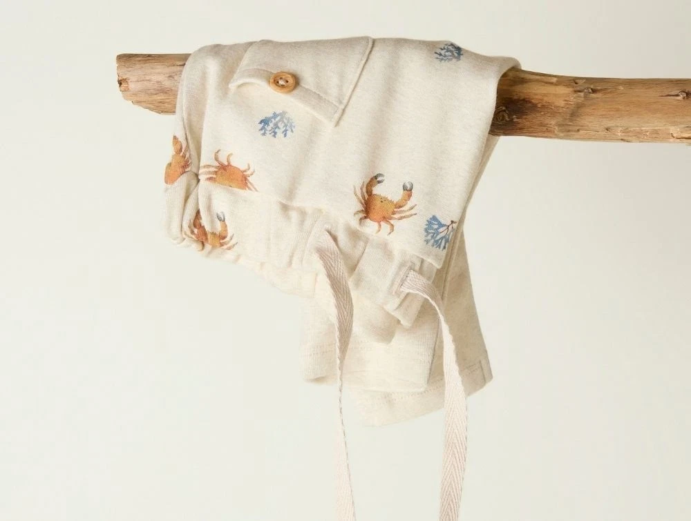 Bukserne er lavet i en blød jerseykvalitet med justerbar talje, pyntesnor og en lille frontlomme. Printet med små krabber er gentaget over hele stoffet, og pasformen er almindelig.