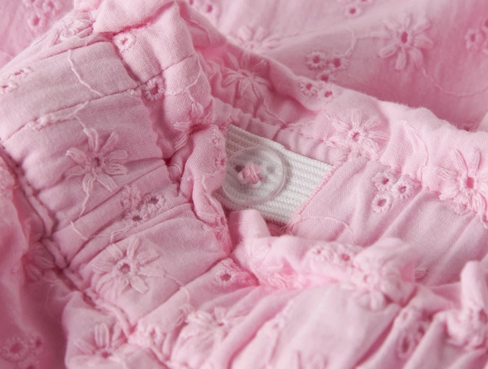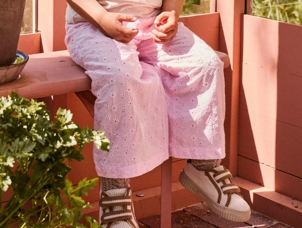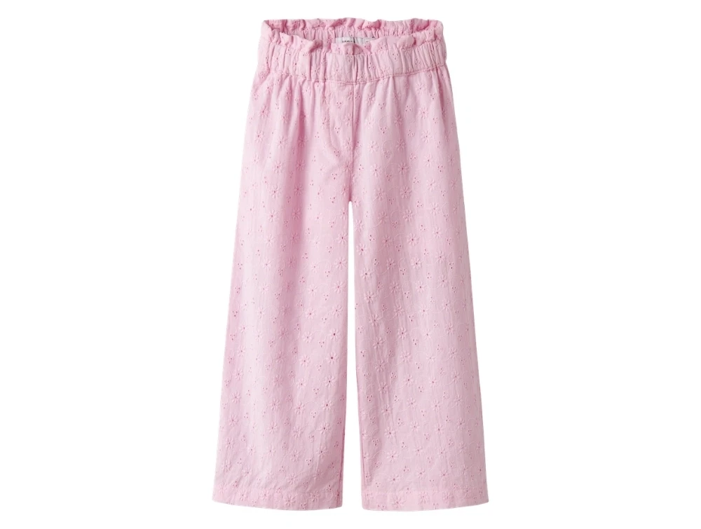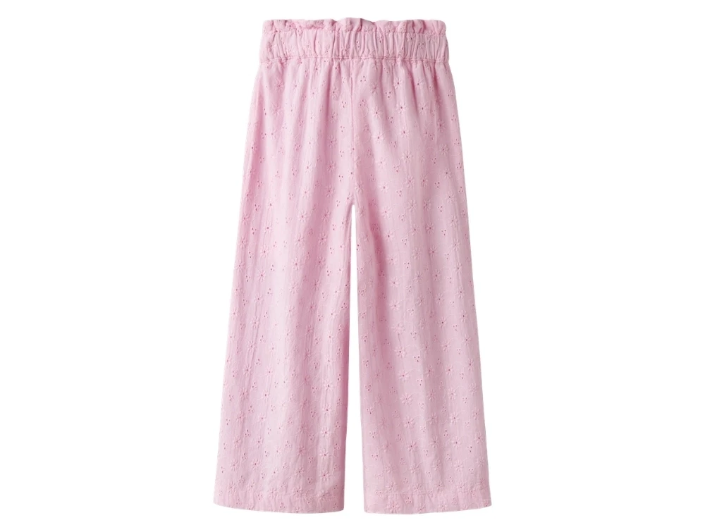 Name It bukser i lyserød nuance med blomsterbroderiName It brede bukser pirouette med jacquardmønsterDetalje af Name It bukser med broderede blomsterName It bukser til børn i lyserød nuance bagfra
